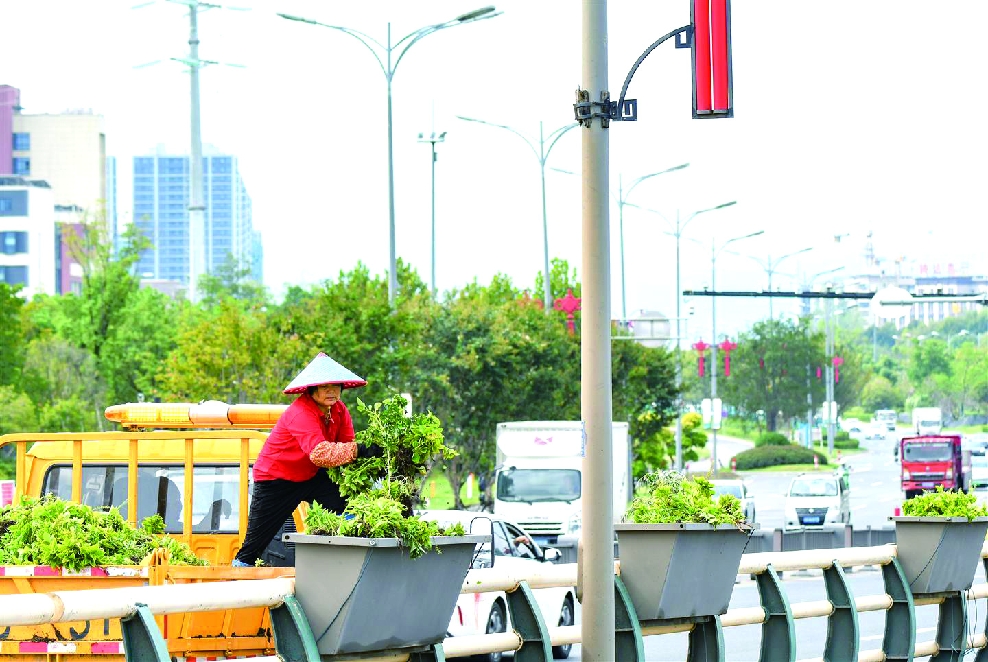 记者 李建林 文/摄 9月10日,在市区婺城大桥上,园林工人正在撤除盛花期已经结束的花卉,陆续摆上矮牵牛、万寿菊、翠菊、孔雀草、彩叶草、羽衣甘蓝、千日红、凤仙花以及鸡冠花等秋季花卉,提前打造美丽宜人、欢乐祥和的国庆氛围。