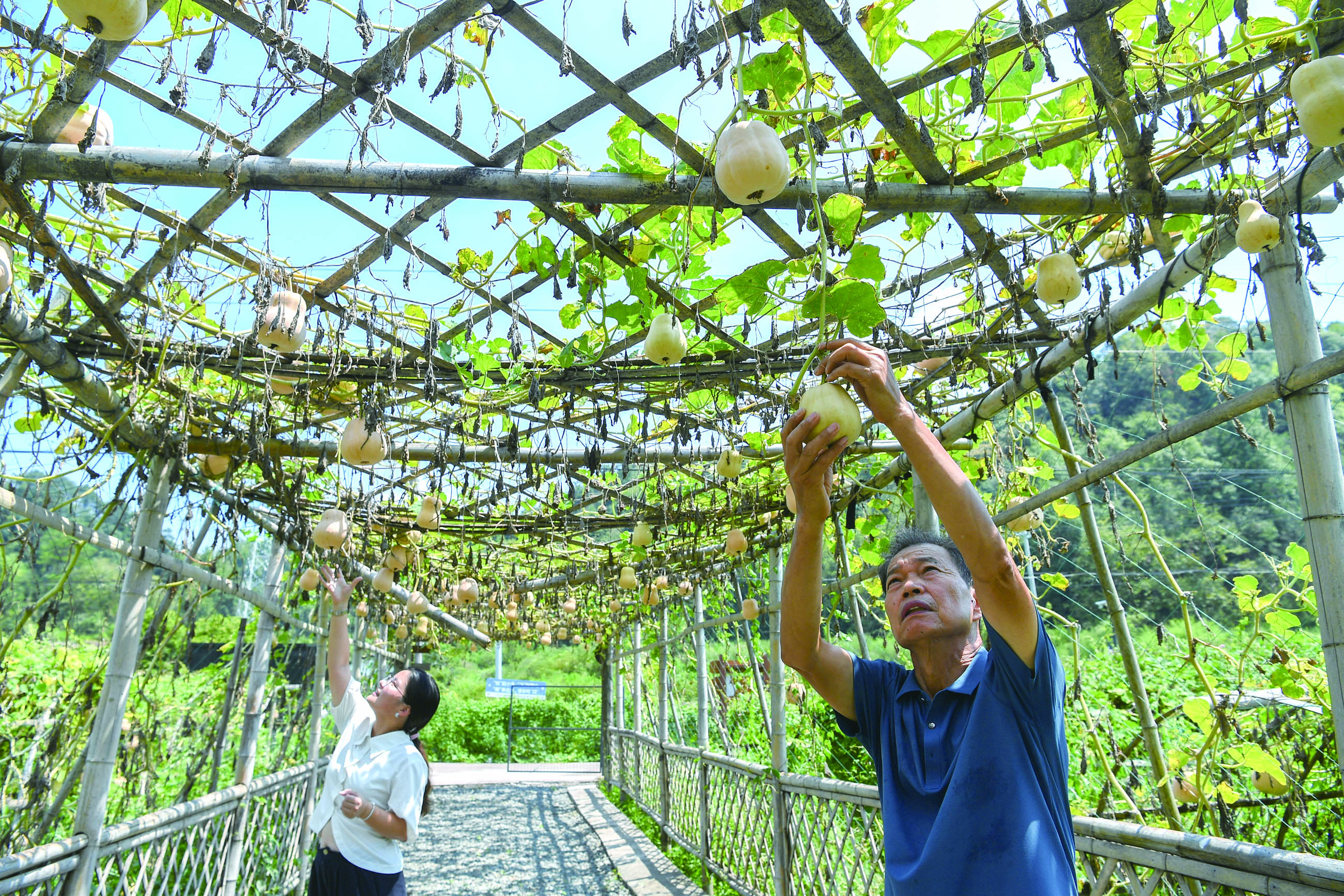 记者 时宽兵 文/摄 昨日,在浦江县前吴乡,成熟的“拉飞”南瓜挂满藤蔓,一片丰收景象。“拉飞”南瓜2022年由省农科院驻浦江县科技特派员引进。据介绍,“拉飞”南瓜无纤维,既可当水果鲜食,也可榨汁、蒸炒等,主要销售到周边县市的餐饮店、食堂等地,助力村民增收。