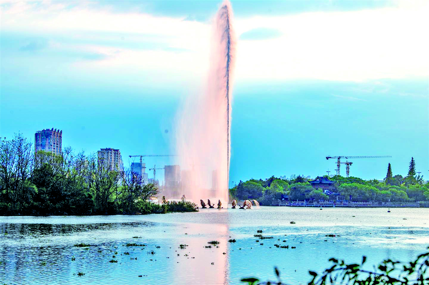 9月11日傍晚,市区婺江中的鲤鱼喷泉喷出近百米高的水柱,成为一道亮丽风景线。