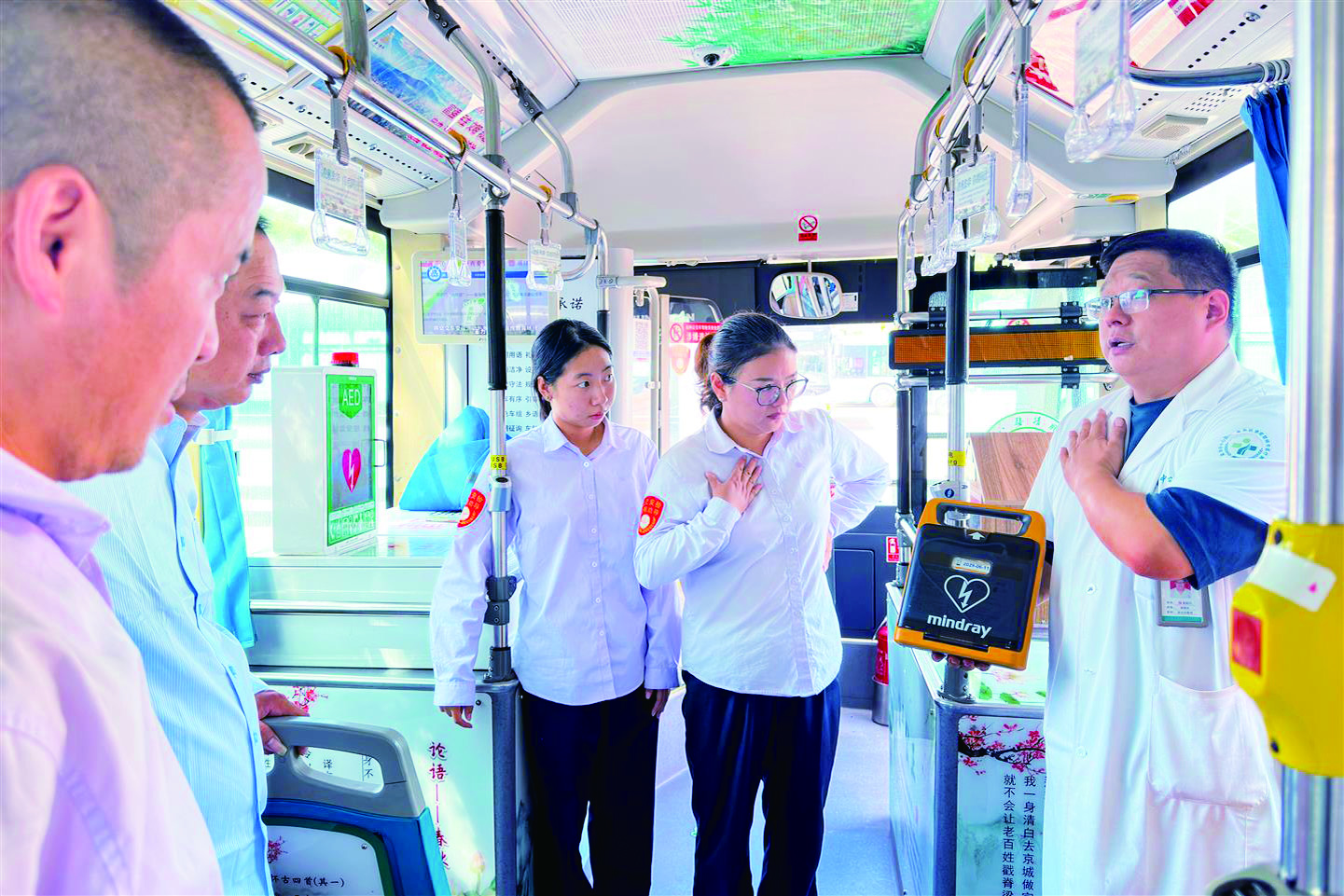 记者 李建林 文/摄 9月13日是第26个世界急救日,主题是“急救与气候变化”。9月11日,市交投公交集团营运二公司在8路公交车车厢里围绕“善行公交 银发守护”项目,请医护人员为公交驾驶员培训心肺复苏、海姆立克急救法以及高温中暑等救护方式,为乘客出行筑牢安全防线。