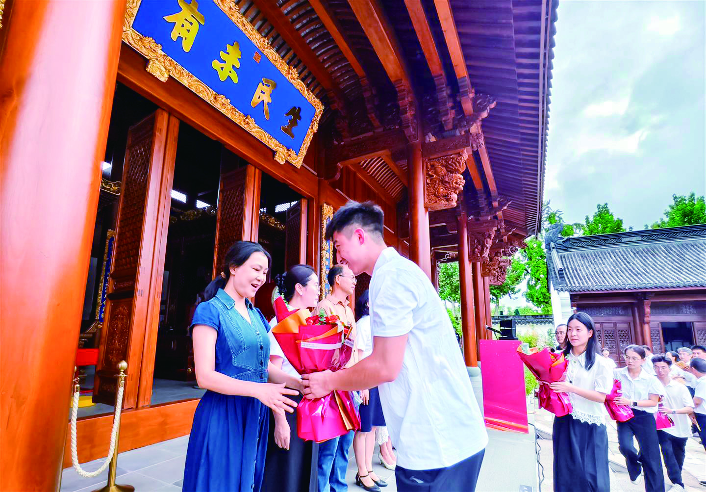 金华一中党委书记、校长方家鸿作为老教师代表致辞。他说,文庙是中华师道的精神象征,是尊师重教的文化圣地。金华一中与文庙有着深厚的文化渊源,孔子仁者爱人、教化育人的思想理念,依旧启发着新时期立德树人、五育并举的教育实践,并与今日所倡导的“教育家精神”一脉相承,其育人智慧、仁爱之心与弘道追求,依旧是所有教育人共同的精神底色与永恒追求。