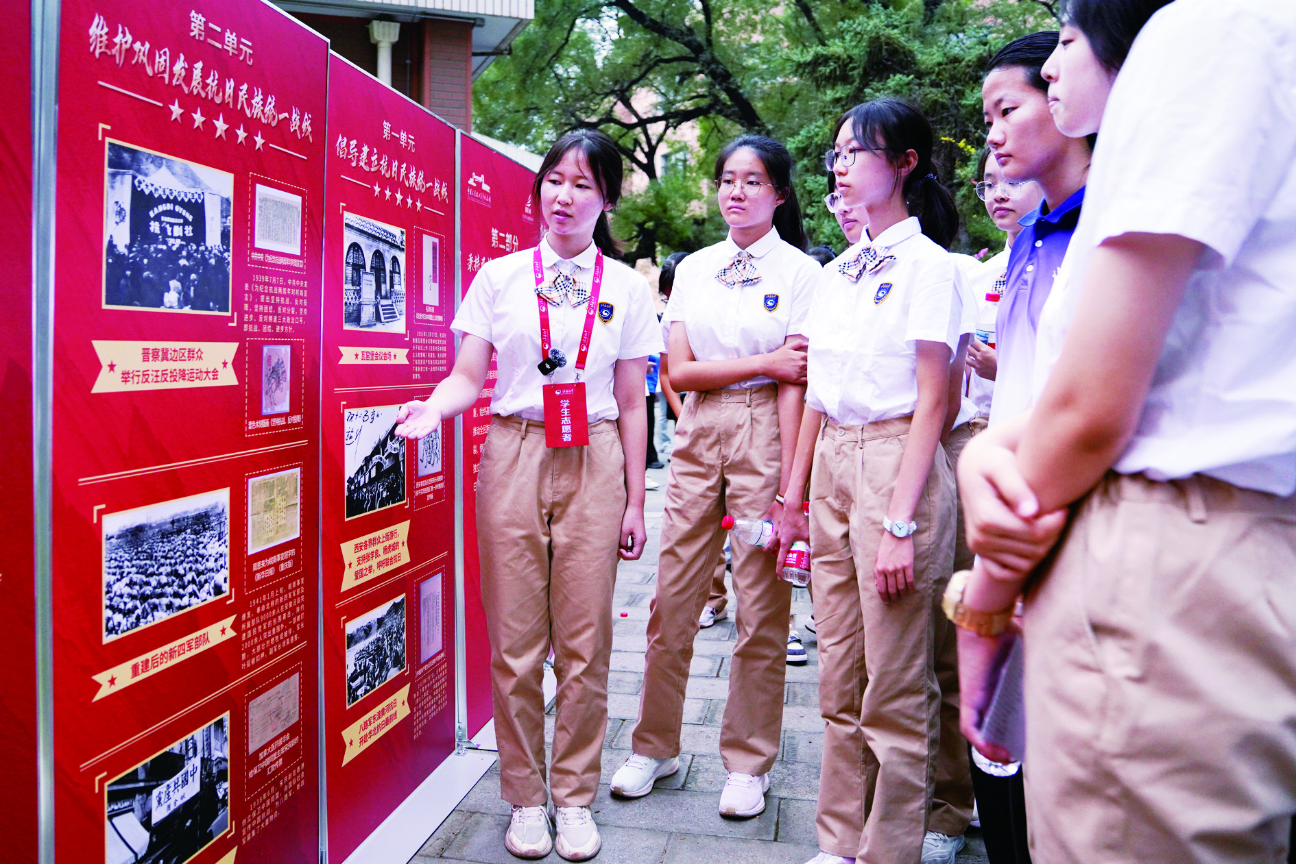 9月12日,北京市第九中学学生在校园里观看“中流砥柱——中国共产党抗战文物展校园巡展”。