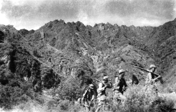 雷烨一手持笔,一手运镜,用相机镜头记录下八路军行军作战、野地宿营的情景,天高意远、雄浑壮阔,表达出对八路军战士的热爱与崇高敬意。如1940年的《行进在祖国边城》、1942年《回旋于热河的万山丛中》,陡峭高耸的山脉下面,是穿梭其间的八路军战士,动静之间衬托出八路军战士的英勇无畏。《冀东子弟兵艰苦生活》系列,抓取八路军读报学习、开会讨论、山岗晚炊瞬间,反映了抗战将士的艰苦卓绝。《塞外山岗上的晚炊》《塞外的宿营地》,则以优美的画面表现革命战士的乐观主义情怀。最令人揪心的是《日寇烧杀潘家峪》系列,被焚烧殆尽的残垣断壁、无家可归仰天大哭的孩子、焦黑圈曲的累累尸骨,惨不忍睹的画面,是对日寇令人发指罪行的有力揭露!
