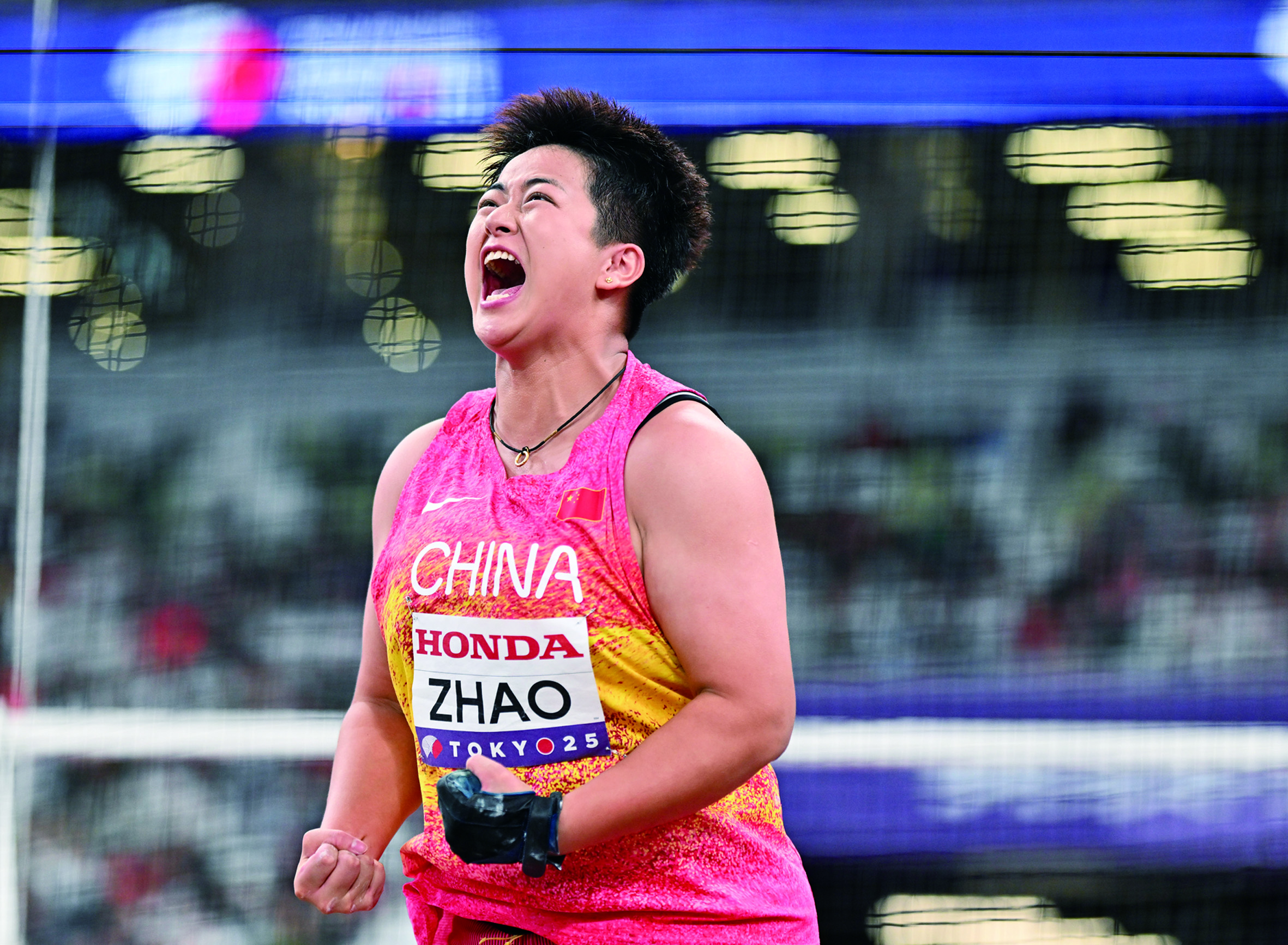 9月15日,中国选手赵杰在决赛中试投后。 当日,在日本东京举行的2025年世界田径锦标赛女子链球决赛中,中国选手赵杰和张家乐分别获得银牌和铜牌。 新华社发