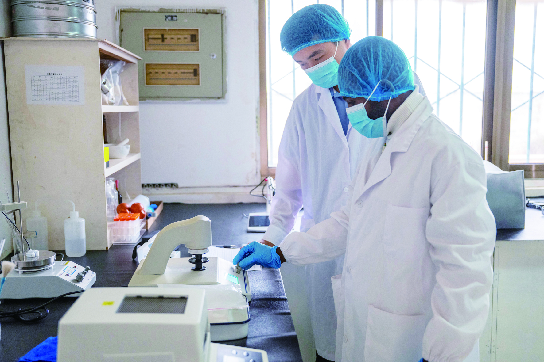 图为9月10日,在刚果(布)西部布恩扎省卢迪马镇生生农业科技有限公司,中方和当地技术人员一起检测木薯粉。 新华社发