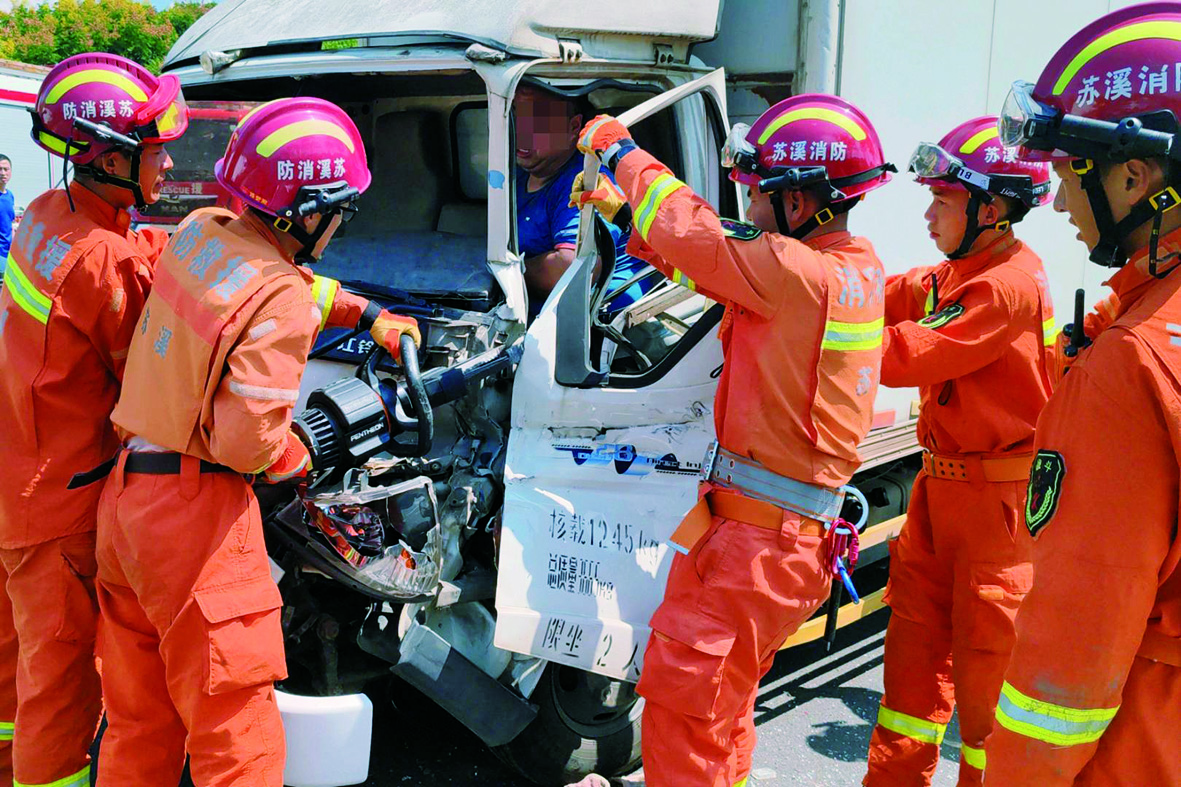 当天11时10分,义乌市消防救援支队接到报警后,迅速调派苏溪镇专职消防队赶赴现场。救援人员到达时发现,厢式货车与前方栏式货车发生碰撞,车头严重变形,前挡风玻璃完全碎裂,驾驶员被卡在驾驶室内无法动弹。栏式货车上的货物散落一地,部分车身冲上绿化带。
