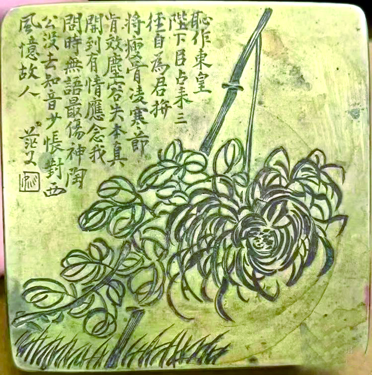 步出咸亨酒店不到百步,就是绍兴古玩城。我们在古玩城的二楼淘到一方菊花题材的铜墨盒。收藏讲究系列,我收藏的“梅兰竹菊”四君子中,独缺菊花,没想到在这里淘到了心仪的宝贝。