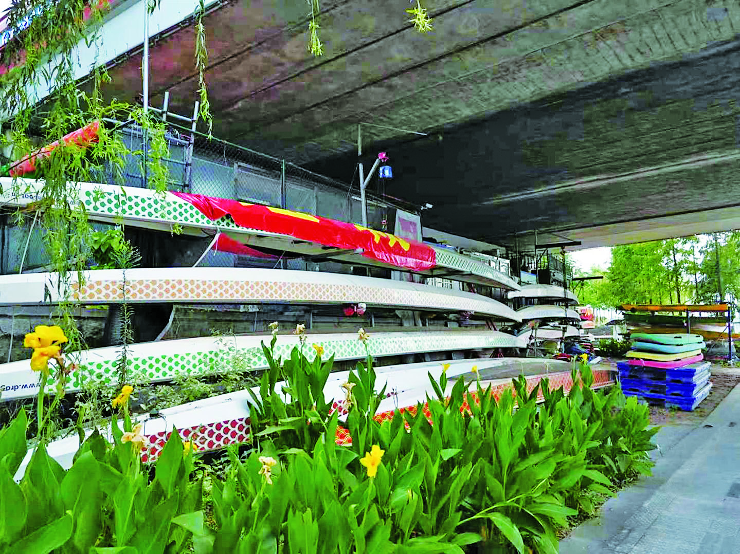训练场地位于金华开发区五百滩公园双龙大桥桥下,当日最高温度达38℃,桥下相对阴凉。“在这里训练再好不过了。”金华女子龙舟队领队翁时文介绍,2021年,市龙舟队龙舟训练基地落户金华开发区,五百滩附近水域水面宽阔,且深浅适中,满足国际龙舟大赛1200米、6赛道的比赛场地条件。