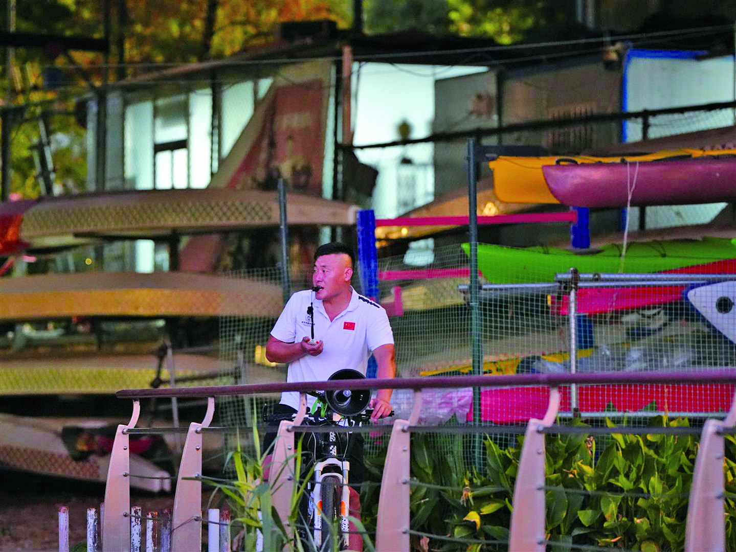 盖勇肤色黝黑、身材高大,是教练伍新成的学生。每当队员们下水训练,他就会拿着秒表、哨子,骑着一辆配备小喇叭的自行车,在岸上跟着龙舟行进。他从2021年9月开始训练金华女子龙舟队。“这批女运动员身高有优势,适合练龙舟。”他因地制宜制定训练计划,增加力量训练、拓展训练,大家为了共同目标咬牙坚持,这支队伍逐渐有了战斗力。