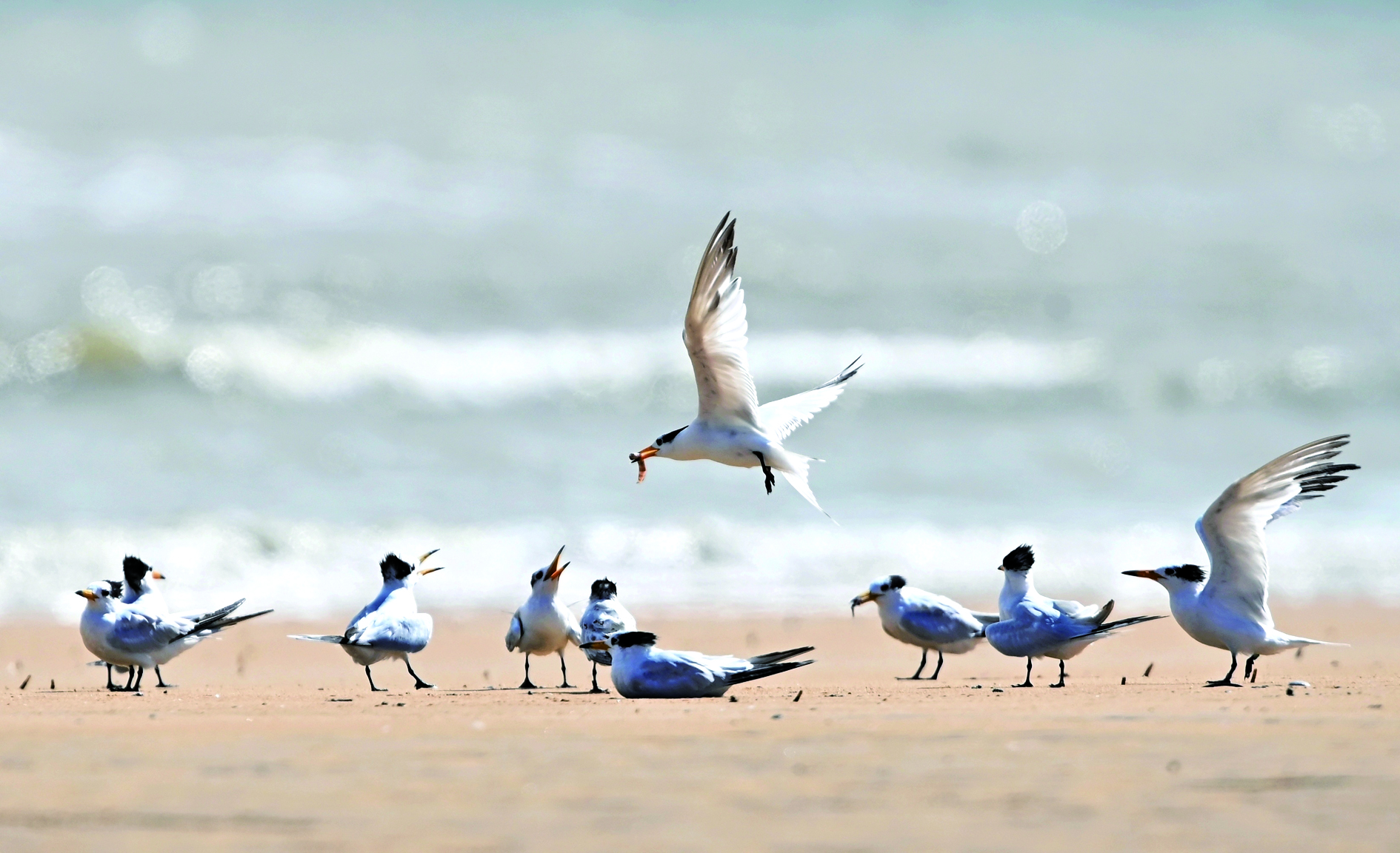 9月25日,中华凤头燕鸥在山东省日照市刘家湾赶海园滩涂上嬉戏,尽显自然生机与生态之美。中华凤头燕鸥是国家一级保护动物,被誉为“神话之鸟”。 新华社发
