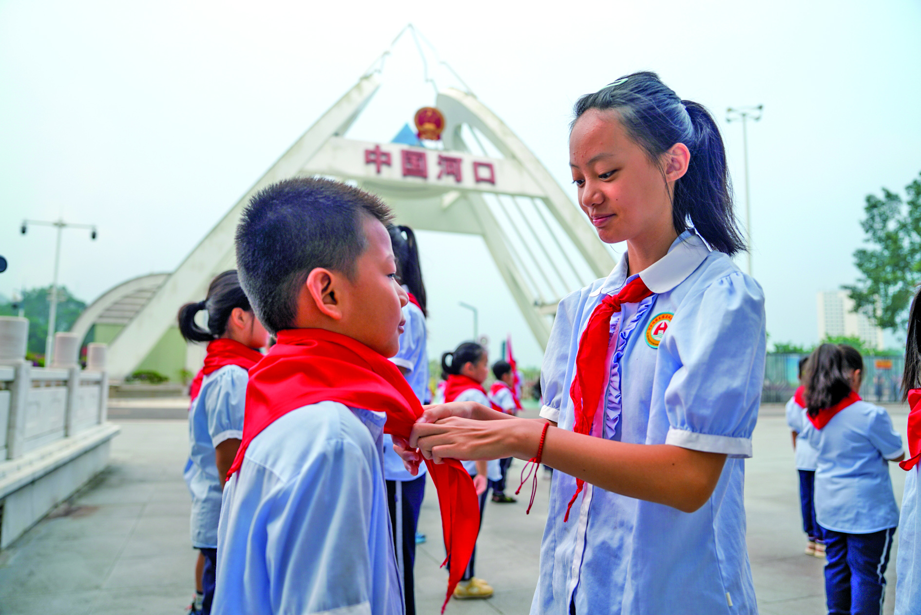 10月13日,在云南省红河州河口县,河口国门小学少先队老队员为新队员佩戴红领巾。 10月13日是中国少年先锋队建队76周年纪念日。 新华社发