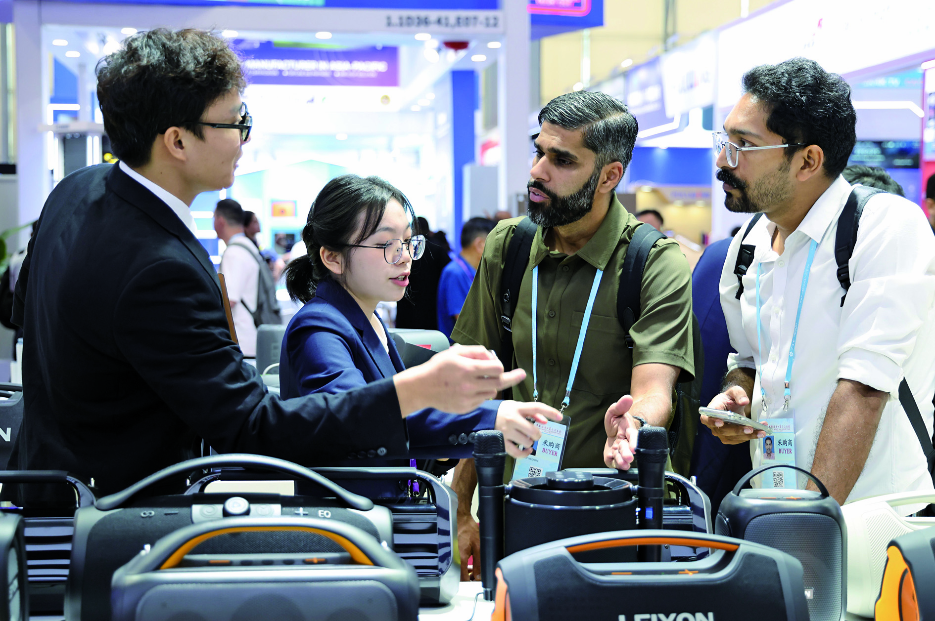 10月15日,客商在广交会上咨询了解音箱产品。 10月15日,第138届中国进出口商品交易会(广交会)在广州开幕。据了解,本届广交会展位总数7.46万个,参展企业超3.2万家,均创历史新高。本届广交会已有超24万名采购商预登记,到会头部采购企业预计超400家。 新华社发