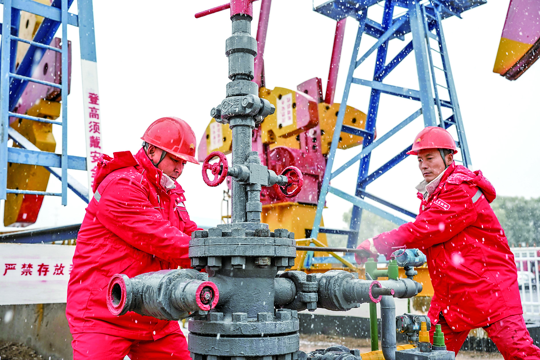 10月15日,大庆油田采油一厂职工在雪中作业。 当日,黑龙江省多地迎来降雪天气。 新华社发