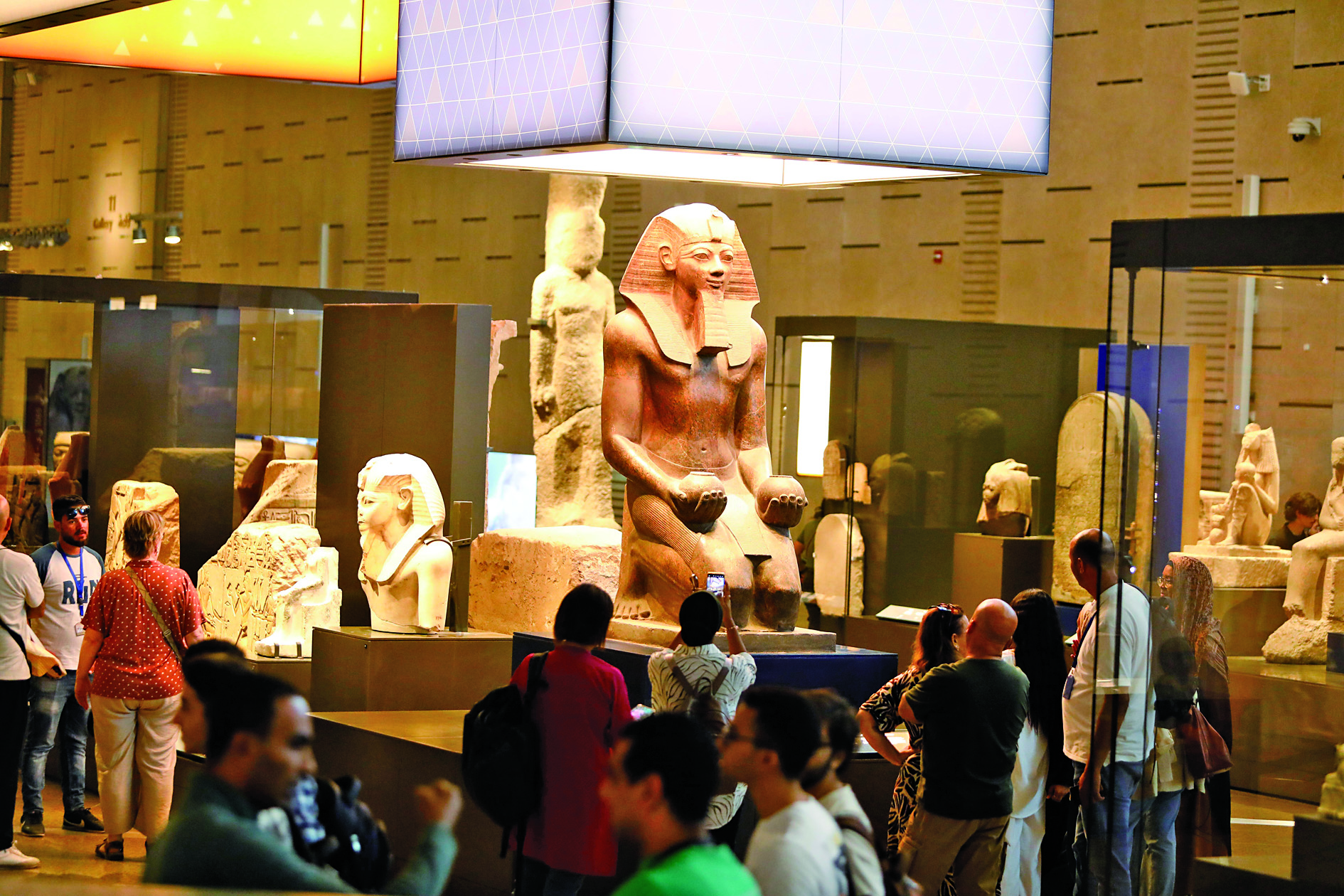 10月14日,游客在位于埃及吉萨省的大埃及博物馆参观。 大埃及博物馆将于15日起暂时关闭,为11月正式开放做准备。该博物馆占地超过50万平方米,可容纳超10万件文物。 新华社发