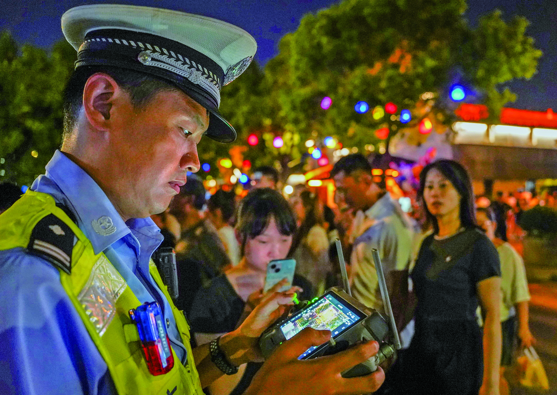 记者 钟路 文/摄 10月15日晚,交警在婺州古城路段操作警用无人机巡查周边车流情况,并将实时画面同步回传至指挥大屏,及时发现并疏导拥堵。
