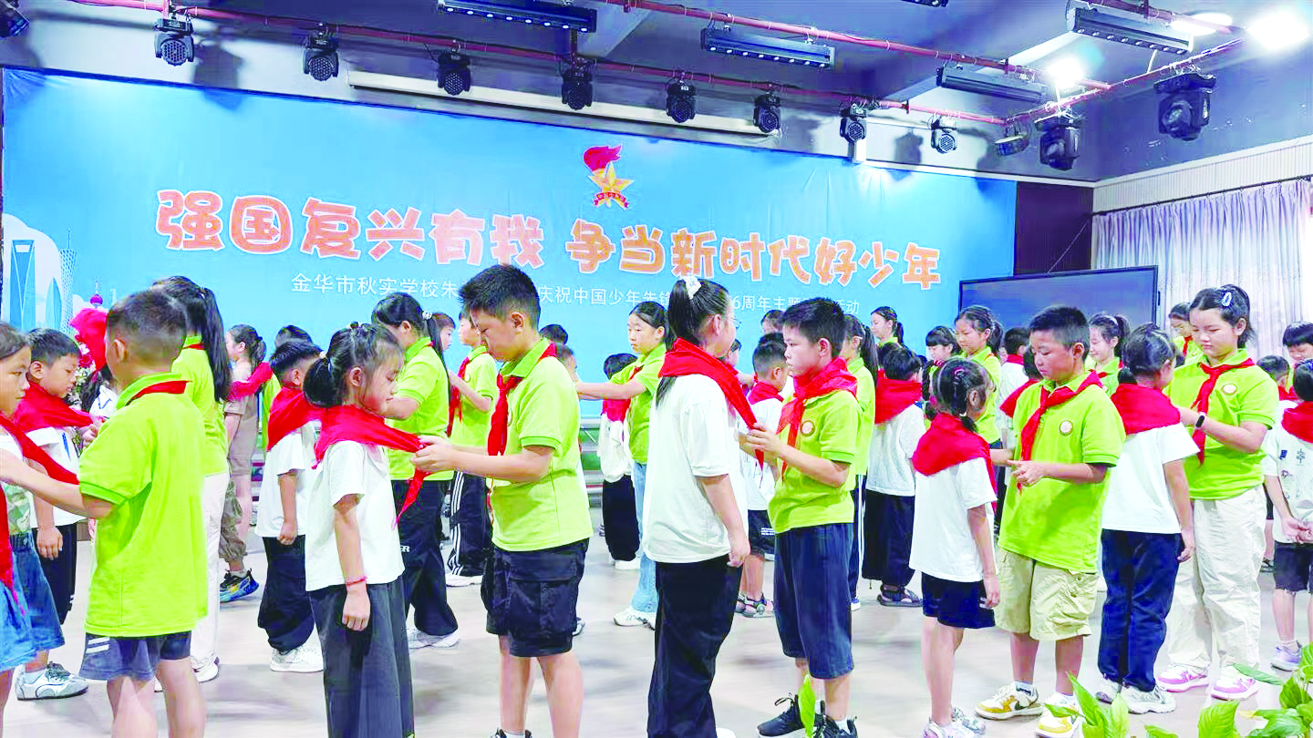 金华市银湖小学党支部书记、校长、少工委主任邵旭则将红领巾比作一份“恒以至臻的修行”,他号召全体队员牢记誓言,在日常学习、集体生活、实践活动中积累智慧、学会担当、增长才干,将个人成长的光彩汇聚成强国复兴的璀璨星河。