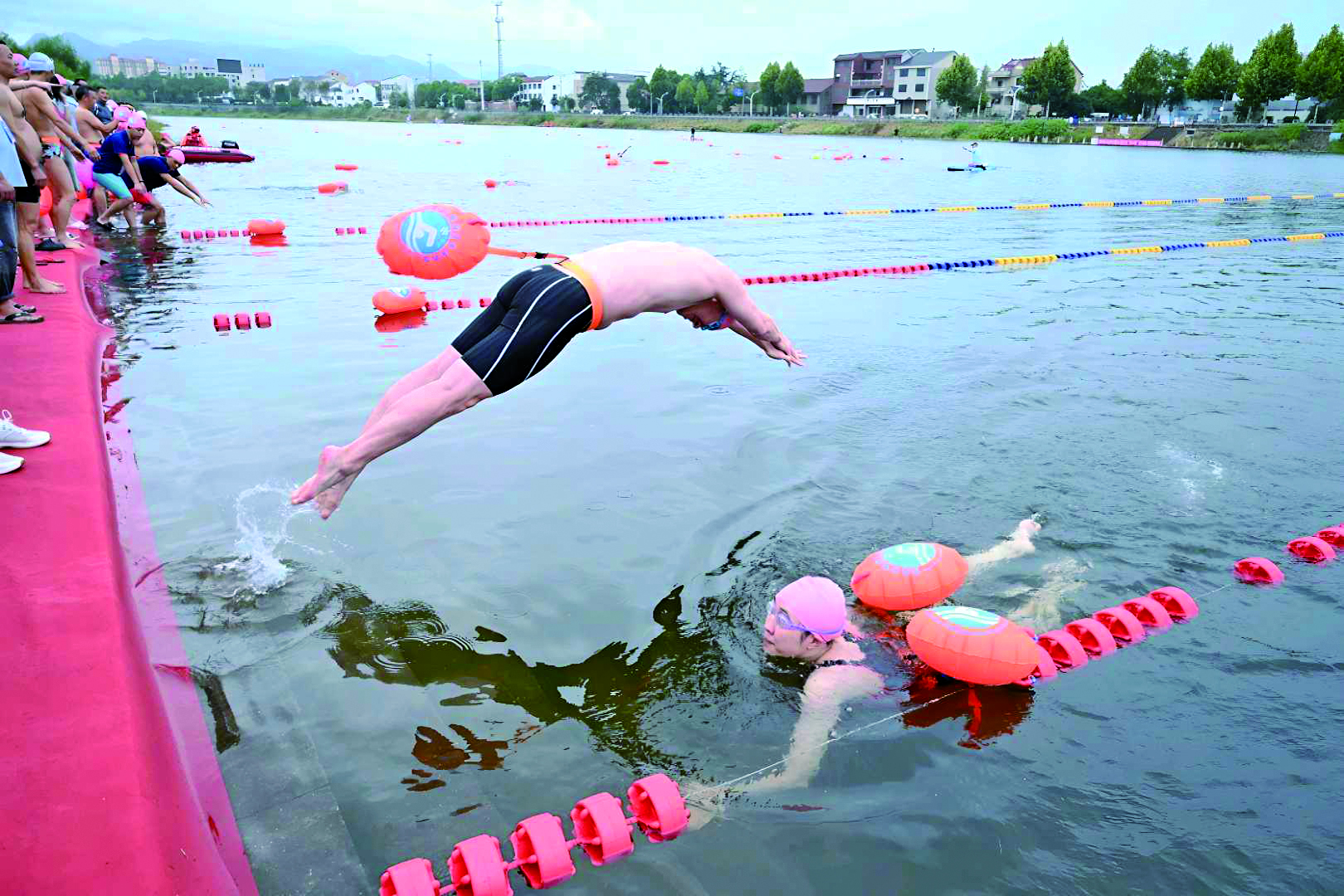 记者 吴潮宏 文/摄 10月18日,婺城区第三届“鸿泰杯”公开水域游泳邀请赛在琅琊镇白沙溪开赛,来自全国各地的34支代表队380余名冬泳爱好者参赛。 本次赛事由市体育总会主办,主竞赛项目为6×200米接力赛和其他畅游项目。