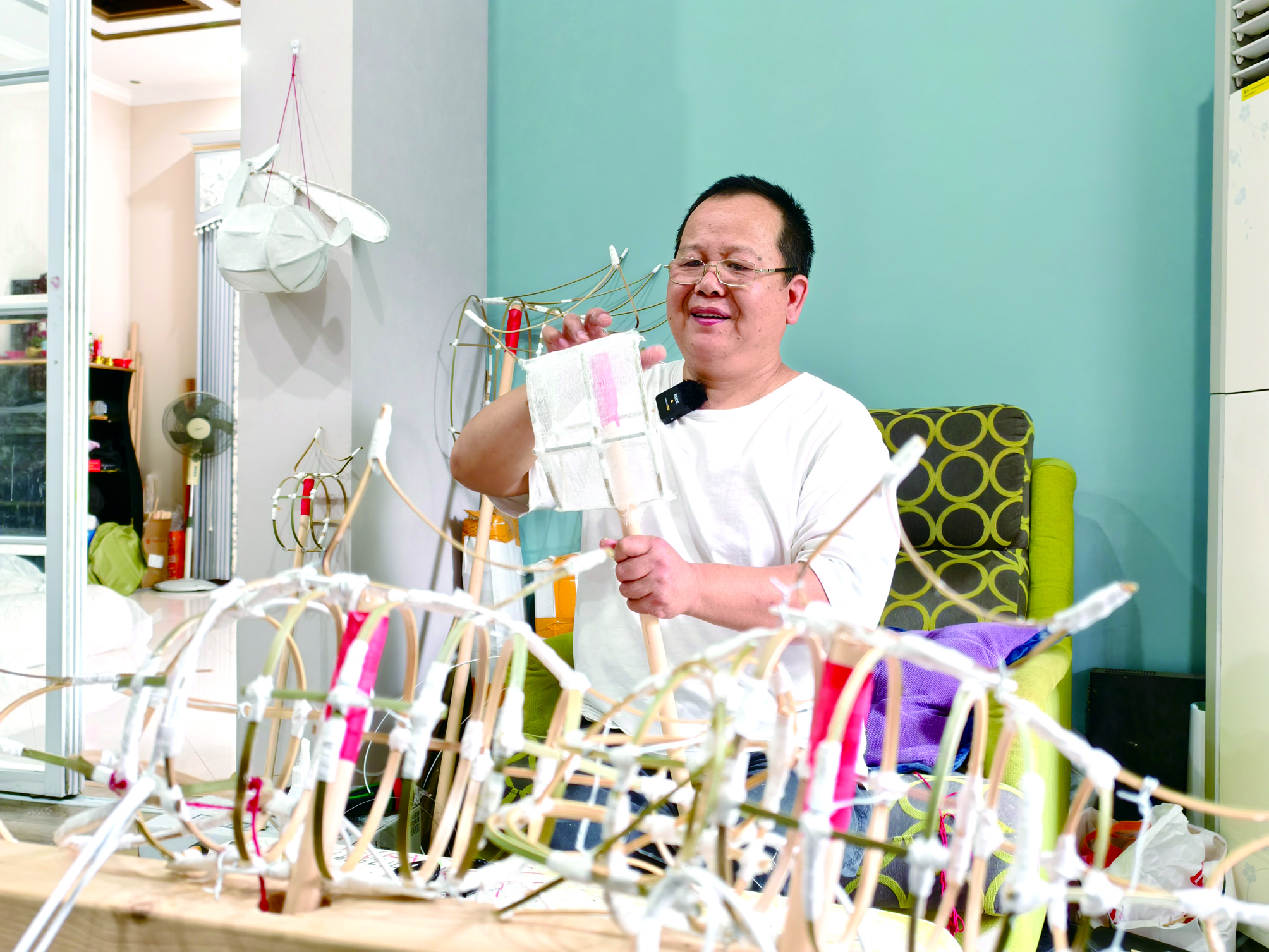在传承中创新,是古老鱼灯焕发新生机的关键。传统鱼灯在骨架表面直接糊上轻薄透亮的皮纸,到了夜晚,鱼灯依靠内置的蜡烛透光显现图案。而黄云洲则在糊皮纸之前先糊上一层粗纱布,“这样既保留了鱼灯的透光性,又极大增加了鱼灯的牢固性,让它不再是一次性的节庆道具,成为了一件可以长久保存的工艺品。”