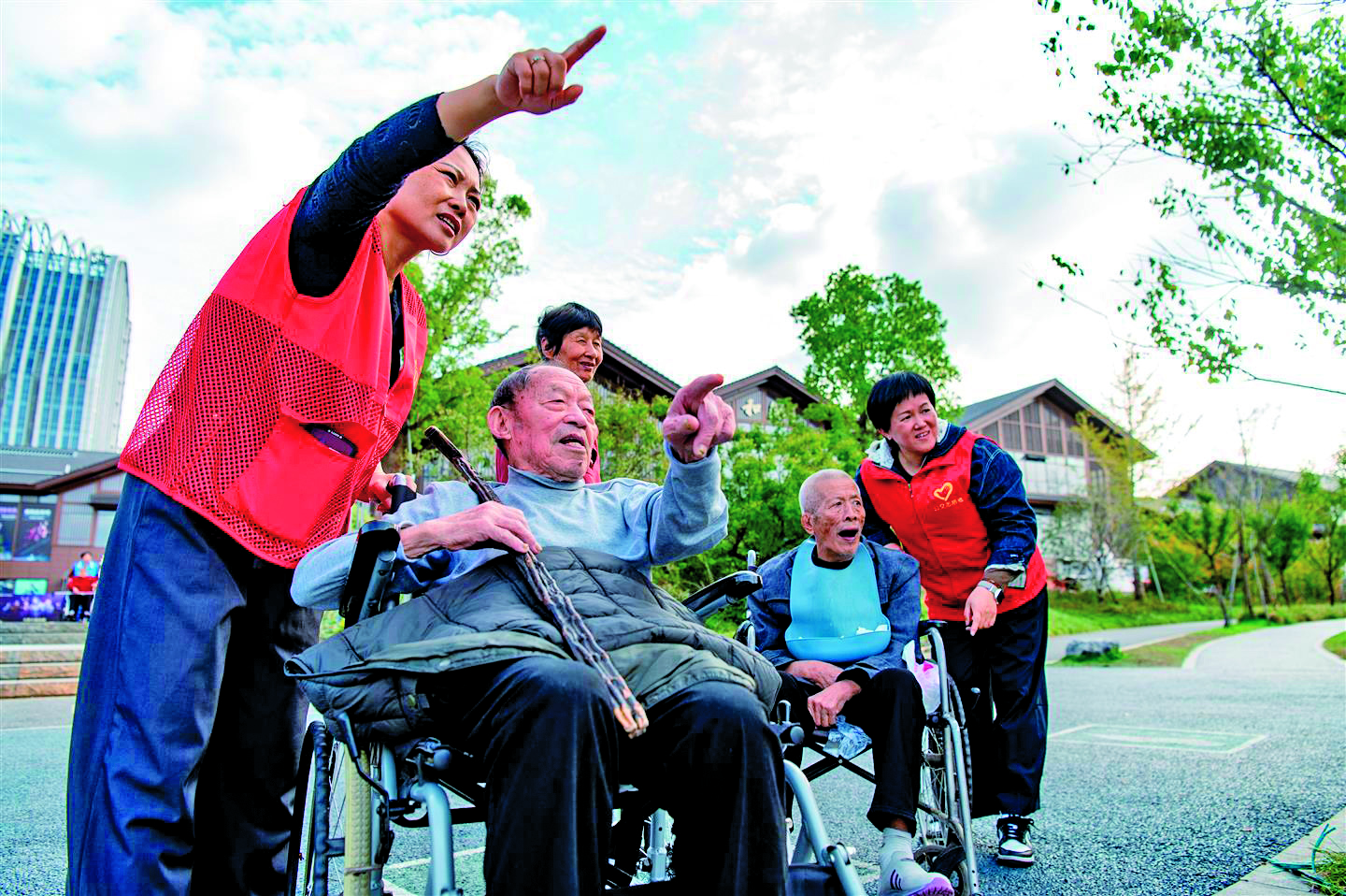 记者 胡肖飞 文/摄 10月29日,在金东区三江口堤岸上,志愿者陪伴行动不便的老人欣赏三江六岸的城市新面貌。据悉,为丰富老人们的生活,市轨交控股公交集团工会组织开展“伴老游三江,共赏新风光”活动。