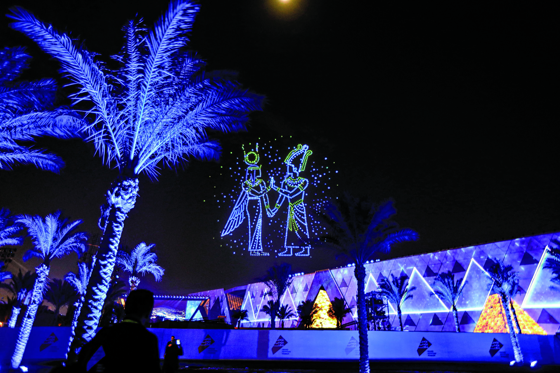这是11月1日在埃及吉萨拍摄的开馆仪式上的无人机表演和灯光秀。 世界最大单一文明博物馆——大埃及博物馆11月1日正式开馆。数十个由各国元首、政府首脑、地区和国际组织负责人率领的官方代表团参加了当晚举行的开馆仪式。 新华社发