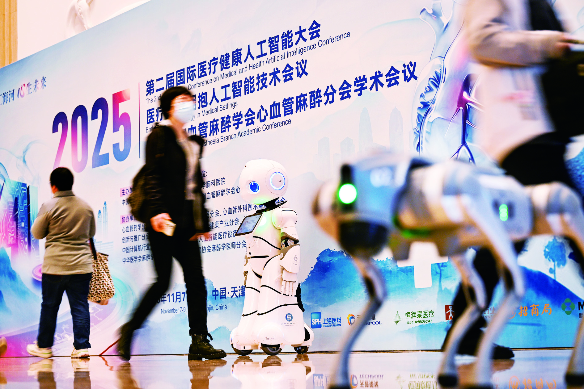 11月8日,与会嘉宾步入第二届国际医疗健康人工智能大会开幕式会场。 当日,由中国心胸血管麻醉学会主办的第二届国际医疗健康人工智能大会在天津开幕。 新华社发