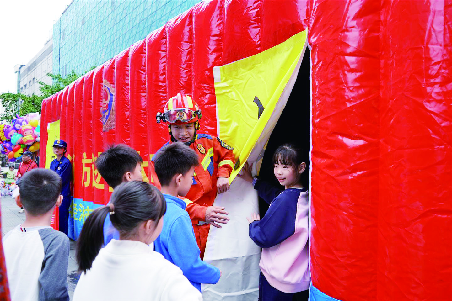 活动现场,受欢迎的还有“烈火迷宫”逃生体验屋。这座充气迷宫模拟了火灾现场的黑暗与紧张感,市民们在消防员的指引下,学习如何在紧急情况下安全、有序地撤离。“刚进去里面很黑,有点害怕,很快我就找到方法出来了。”小学生杨硕用时1分钟“逃生”成功,他将在学校里刚学过的火灾逃生知识在现场实践了一把。