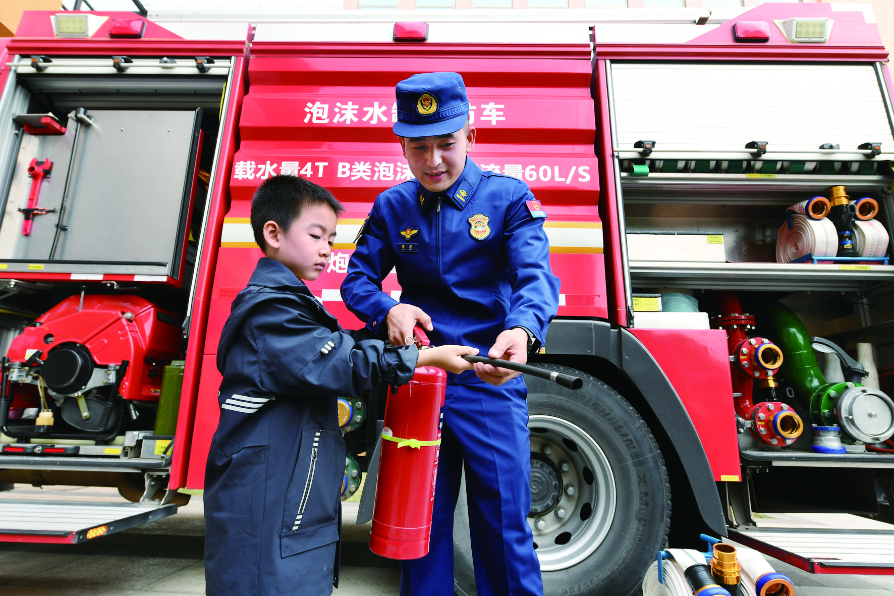 除了趣味互动,活动还设置了多个展示体验区。在“生命之光”消防器械装备展示区,消防员现场演示了液压钳夹乒乓球等高精度操作。消防灭火无人机也来到了现场,“它可以同时搭载6枚25L森林灭火弹,灭火范围约150平方米,可瞬间压制火势。”现场负责人汪明说,消防灭火无人机可以用于森林灭火,也可用于城市高层建筑火灾扑救。