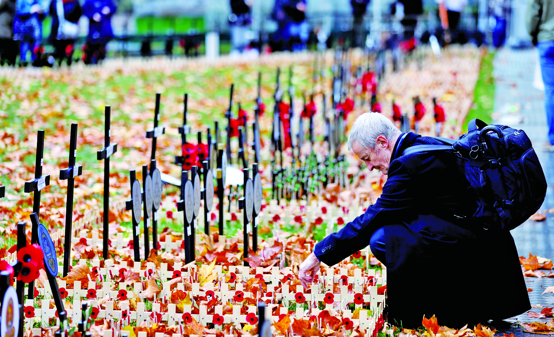 11月10日,在英国伦敦威斯敏斯特教堂外,一名男子整理悼念标识。 11月11日是英联邦国家停战纪念日,人们在英国伦敦悼念在战争中阵亡的将士。 新华社发