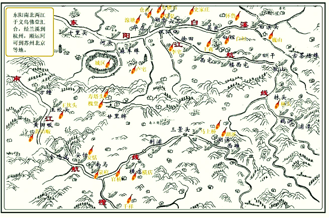 方塘、南岸是村落,再往北流是义乌的画坞坑、王坞坑、坑口村,直至俗称的三江口(佛堂附近)与东阳北江汇流统称东阳江。