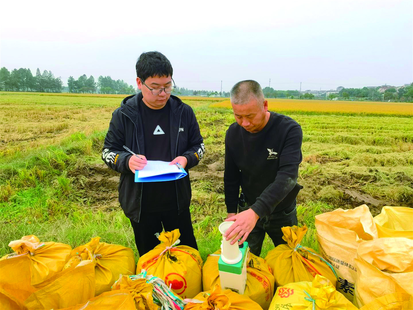 城西村种粮大户蒋孝平忙着用袋子接装刚脱粒的稻谷,开发区乡村振兴部农业一科工作人员吴迅则从刚脱粒的稻谷中选取新鲜稻米,倒入谷物水分测定仪,并将测定的相关数据逐一记录,最后扎紧口袋对稻谷进行过磅称重。“选取湿谷先测水分含量,再算标准干谷产量,三亩地取平均值,最终测产达每亩713公斤。”看着检测结果,蒋孝平脸上满是笑意。