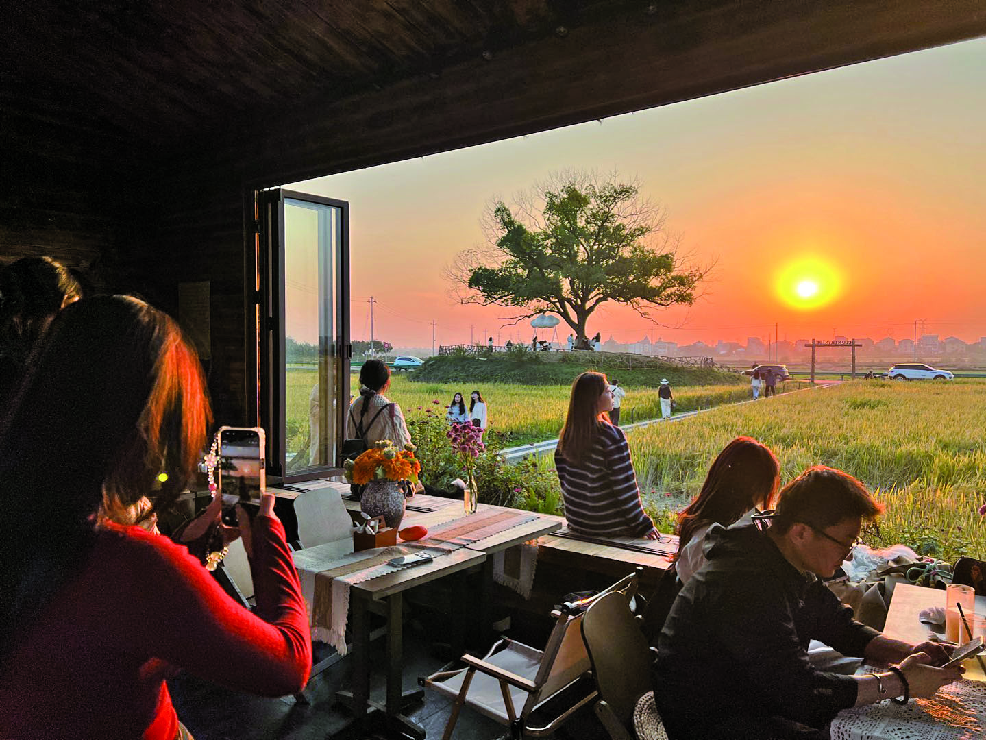 记者 徐莹 文/摄 11月16日下午,小娅约上朋友到金东区塘雅镇清江村金尚塘自然村万亩良田游玩拍照。这个秋天,近郊游在金华悄然走热,市民们不再执着于远行,而是去近郊田园风光中寻找诗意周末,在金色稻田边喝咖啡成了新风尚。 稻田中,一棵造型独特的大树下聚集着拍照的游客,搭建在田间的木屋咖啡馆座无虚席。分别从上海和杭州回到金华工作的小娅和阿易告诉记者,周末、假日与朋友家人到近郊走走,看看夕阳再找个餐厅小聚,这已成为他们享受生活的好方式。