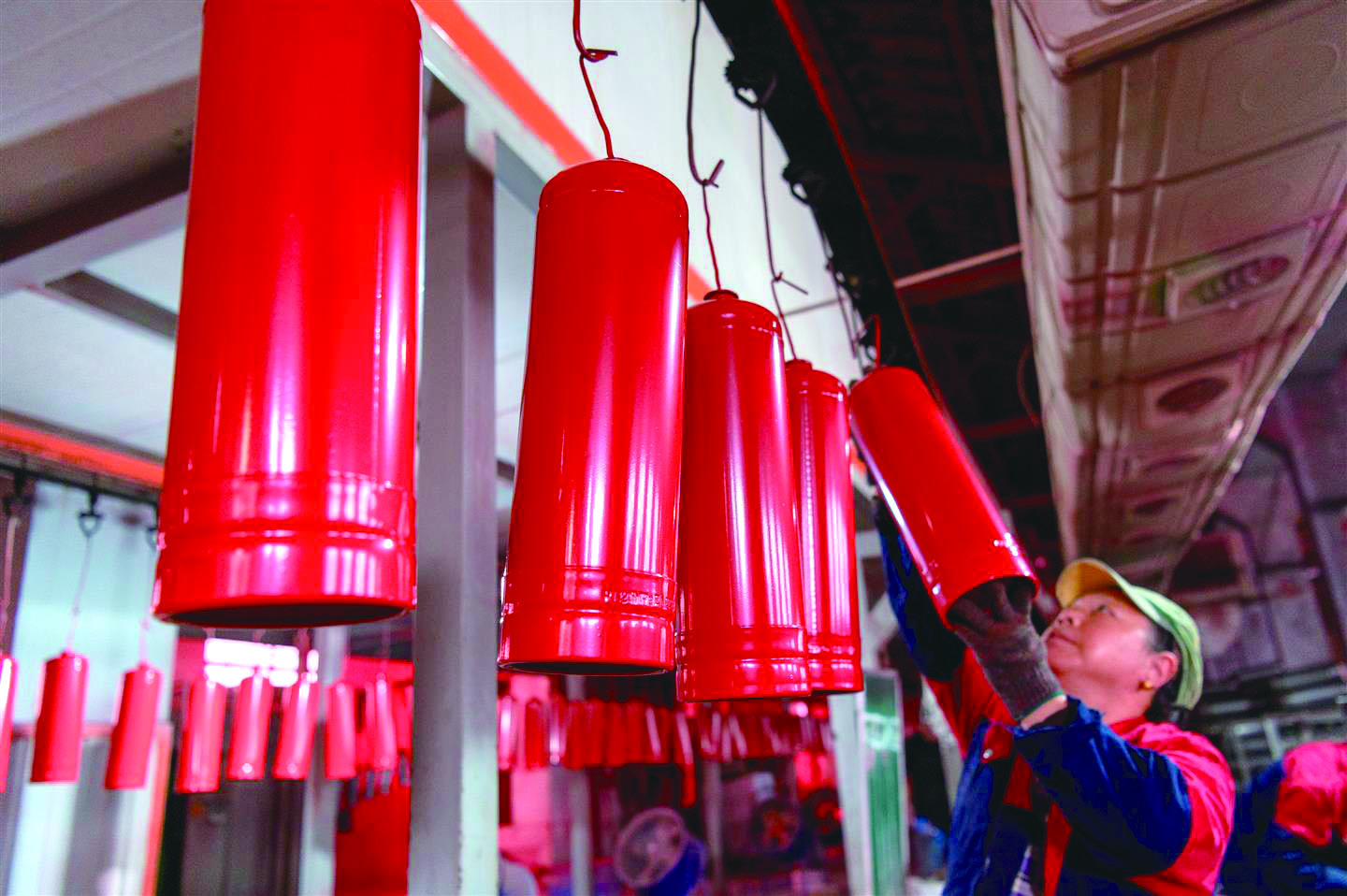 记者 胡肖飞 文/摄 昨日,兰溪市浙安消防设备有限公司生产车间里,工人在生产灭火器瓶体。11月是金华市消防宣传月。连日来,金华市消防设备生产企业忙生产赶订单,确保消防器材及时销往全国各地。