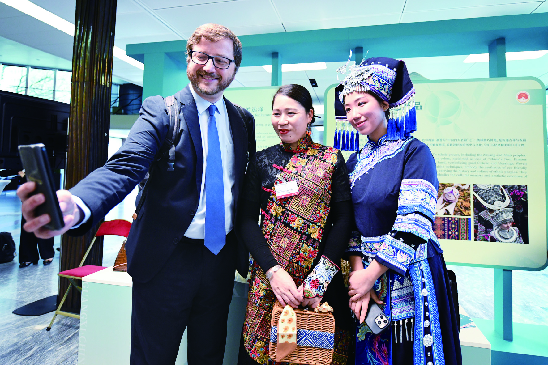 11月17日,在瑞士日内瓦世界知识产权组织总部,一名参观者在“中国(广西)地理标志产品展”上与身着民族服饰的工作人员合影。 新华社发