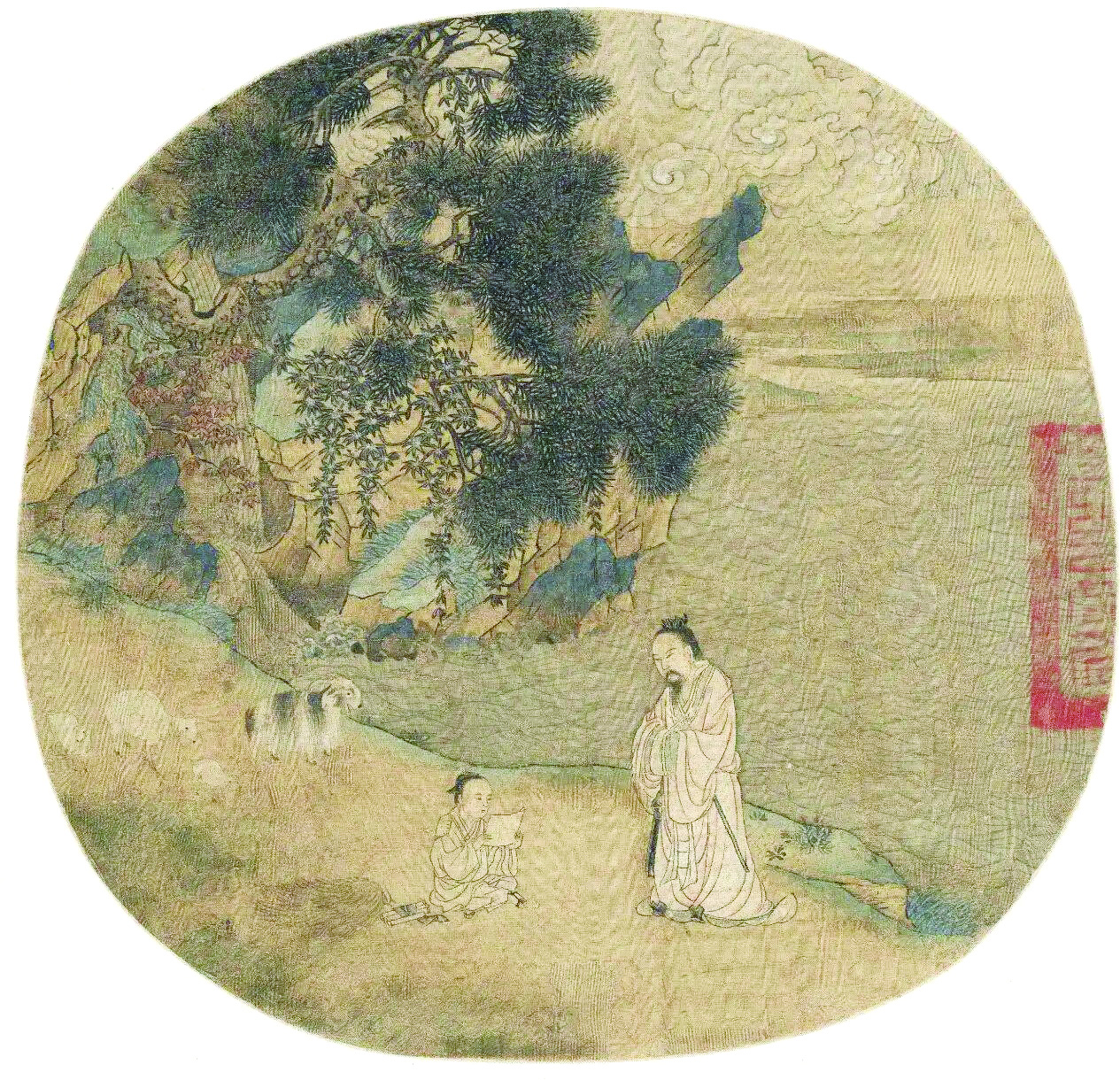 《中国绘画全集》收录此画,名为《叱石成羊图》,留有说明:“此图不知原载何册,又名《初平牧羊图》。图绘土坡上一长者袖手而立,倾听席地而坐的童子捧卷朗读,身后四只山羊,其态自在……童子认真朗读,长者凝神聆听的神情,羊群悠闲的形态刻画得入木三分……”此童子,正是黄大仙的少年形象。