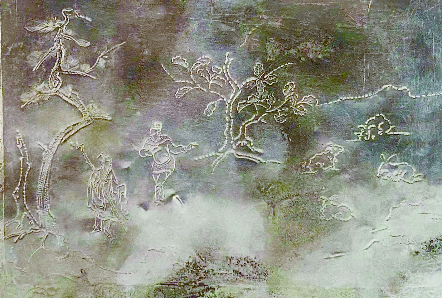 上世纪80年代,义乌柳青乡(现北苑街道)游览亭村出土一座北宋银器窖藏,其中一片錾刻人物故事银花片,再现了叱石成羊的经典场景。银花片图案以刀代笔,策杖老者黄初起与伸臂作指点状的少年黄初平相对而立,山坡间松树细密,羊群卧于一侧,展现了宋代工艺美术对此题材的艺术处理。