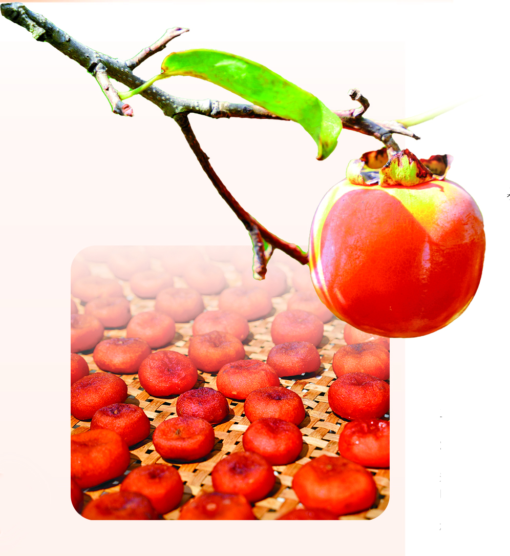 成熟的柿子被刮去外皮,柿蒂朝上,一个个码放在竹匾里,托付给秋日的阳光与微风。风带走果实的水分,使得果实变暗,果肉萎缩,并在表面形成一层霜糖层。过两三周,原先饱满水灵的柿子,便蜕变成一枚枚厚实软糯的果脯,将一整个秋天的味道,紧紧地锁在其中。