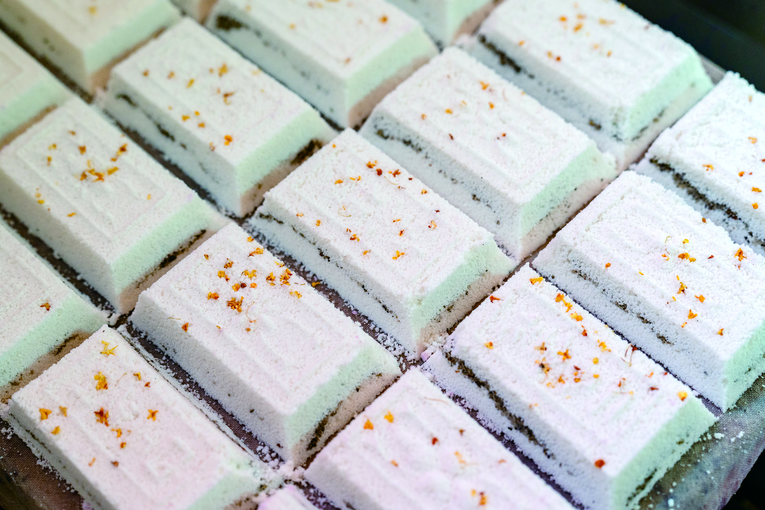 桂花糕的制作,讲究的是真材实料与手艺分寸。“我们家传统口味桂花糕的糕体由糯米粉和东北原浆米混合制成,馅料中放了桂花蜜、芝麻、核桃与花生。等到天气转凉,还新增艾草、南瓜、蔓越莓以及咖啡口味。”许凤余掀开笼屉,刚蒸好的桂花糕热气腾腾,取一块品尝,先感受到糕体的软糯弹性,随后就是桂花的清香与芝麻、核桃的绵密质地,口感层次分明。