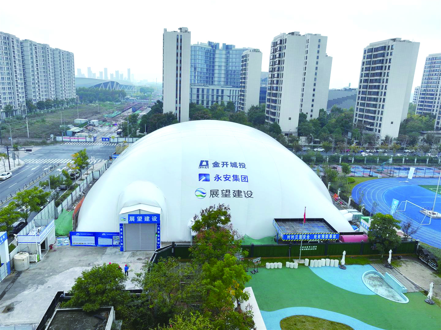 11月13日,在金华开发区李渔幼儿园西侧停车场及附属配套工程现场,记者看到一个类似充气城堡的“罩子”扣在工地所处地块。“这是金华市区范围首个采用基坑气膜的工程。”金华金开城市建设集团有限公司项目负责人胡春华介绍。