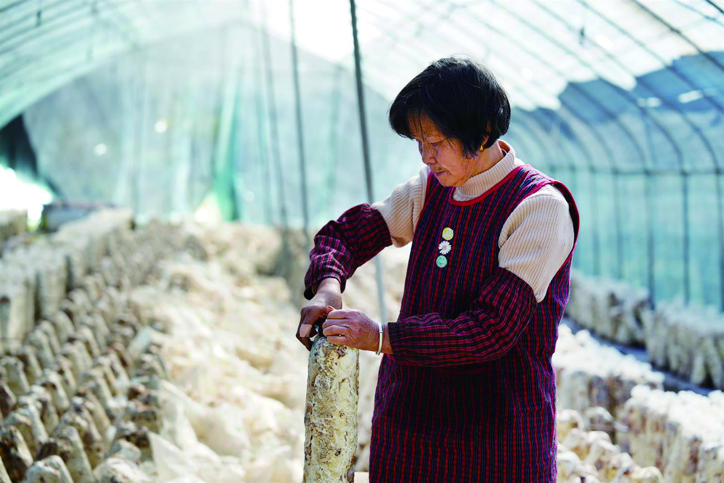 金华平丰科技农业有限公司总经理洪珍发介绍,目前大溪口乡的47座香菇大棚共培育传统菇31万棒。菌棒以木屑和麸皮为基料,今年6月完成菌丝接种,经数月养菌,陆续进入脱袋期。脱袋完成后将分批出菇,采收工作可持续至明年5月底,形成“一茬接一茬”的循环收获节奏。