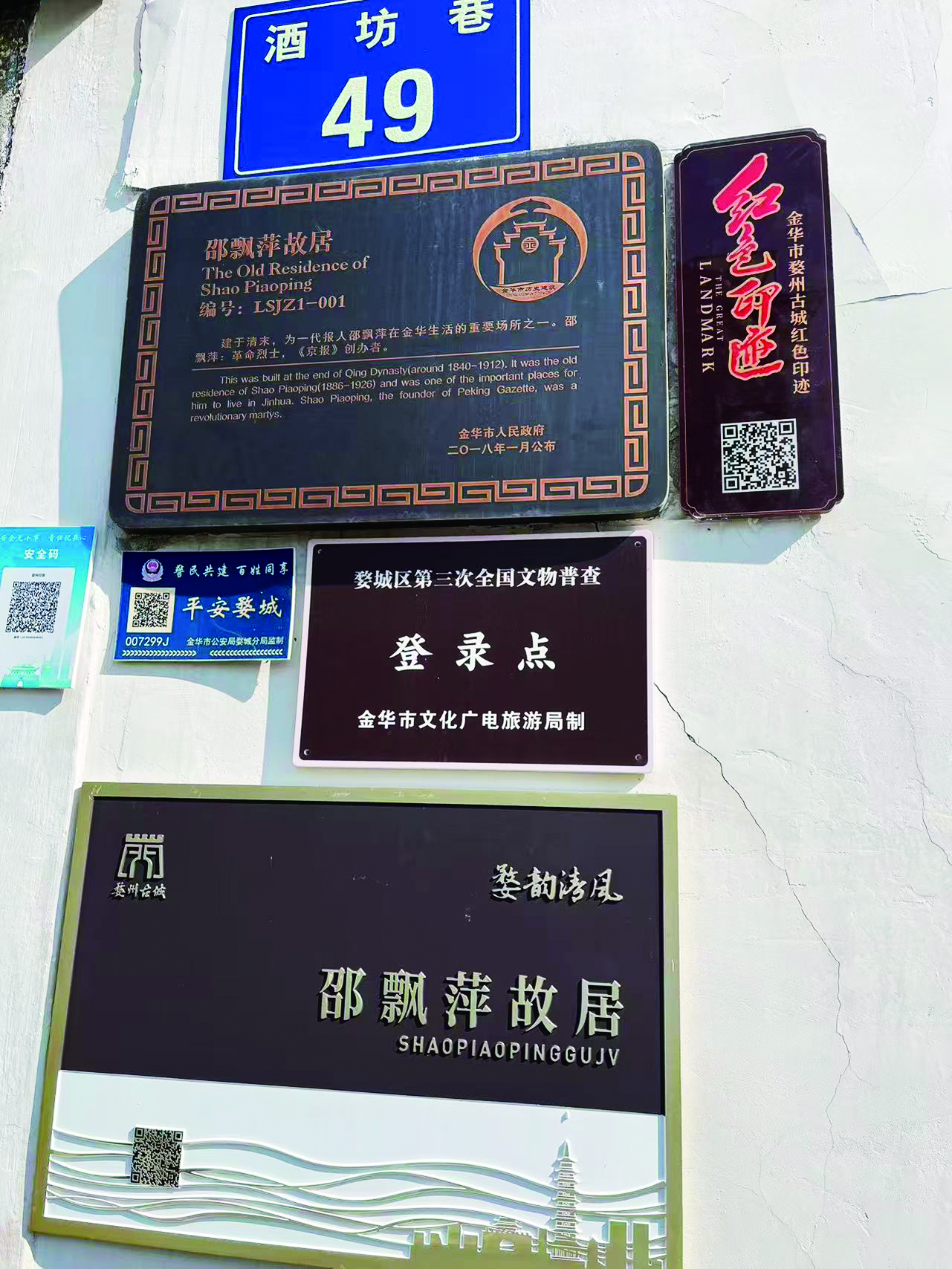 酒坊巷49号邵飘萍故居门前墙上有婺州古城文旅公司制作的“红色印迹”二维码标牌,扫一扫二维码,即能显示该处邵飘萍故居的介绍文字:原为邵飘萍夫人汤修慧的父亲(时任金华知府师爷)在酒坊巷南口开设的照相馆场所。对照2023年我市文物部门的命名标准,“故居”似乎不符。原因在于,该处门前“邵飘萍故居”铜质铭牌是2018年颁发的。