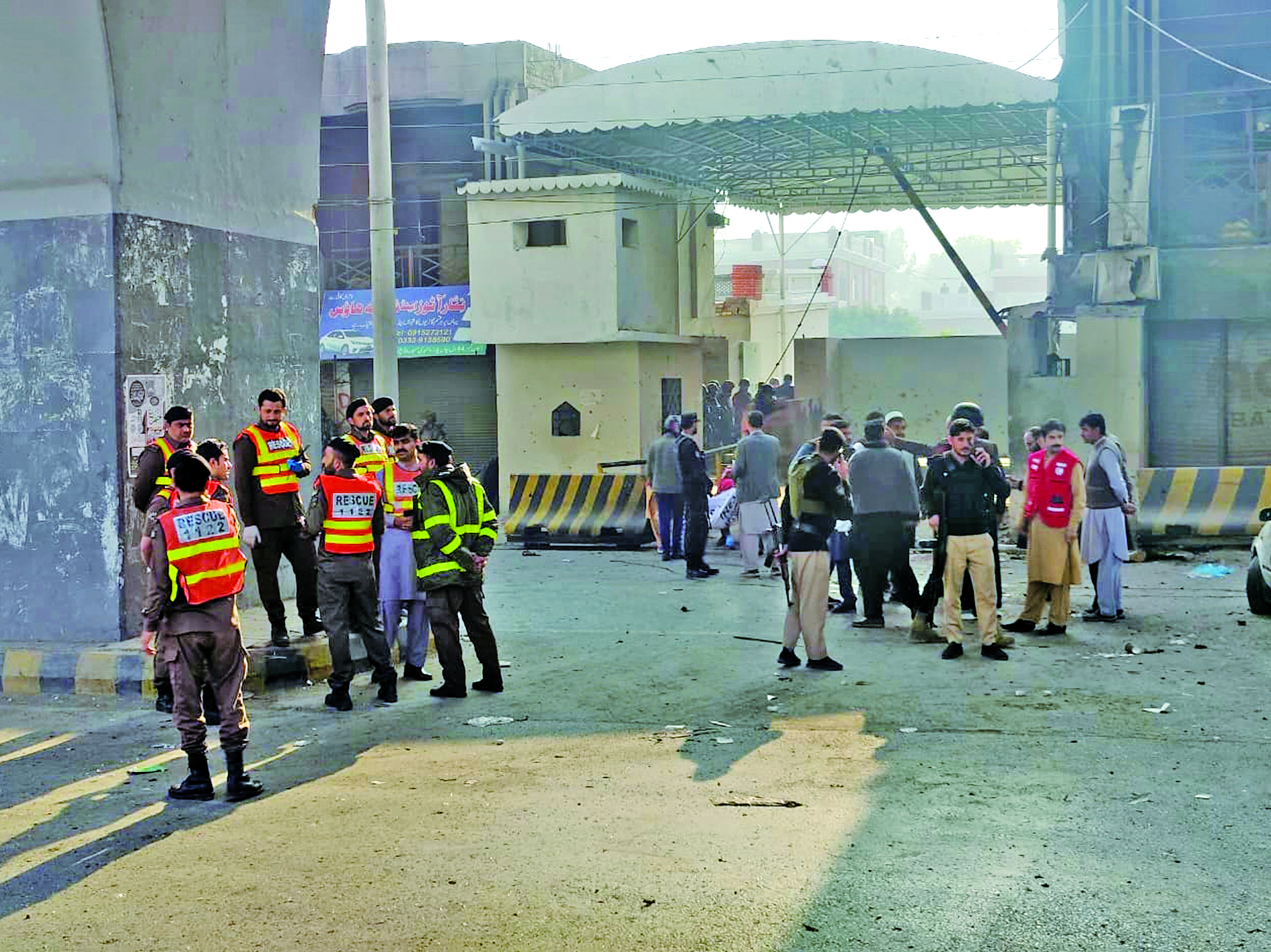 这是11月24日在巴基斯坦西北部开伯尔-普什图省首府白沙瓦拍摄的爆炸袭击现场。 巴基斯坦警方24日说,位于该国西北部开伯尔-普什图省首府白沙瓦的一警察部队总部当天清晨遭自杀式爆炸袭击,目前已有两名伤者被送往医院救治,现场仍有交火。 新华社发