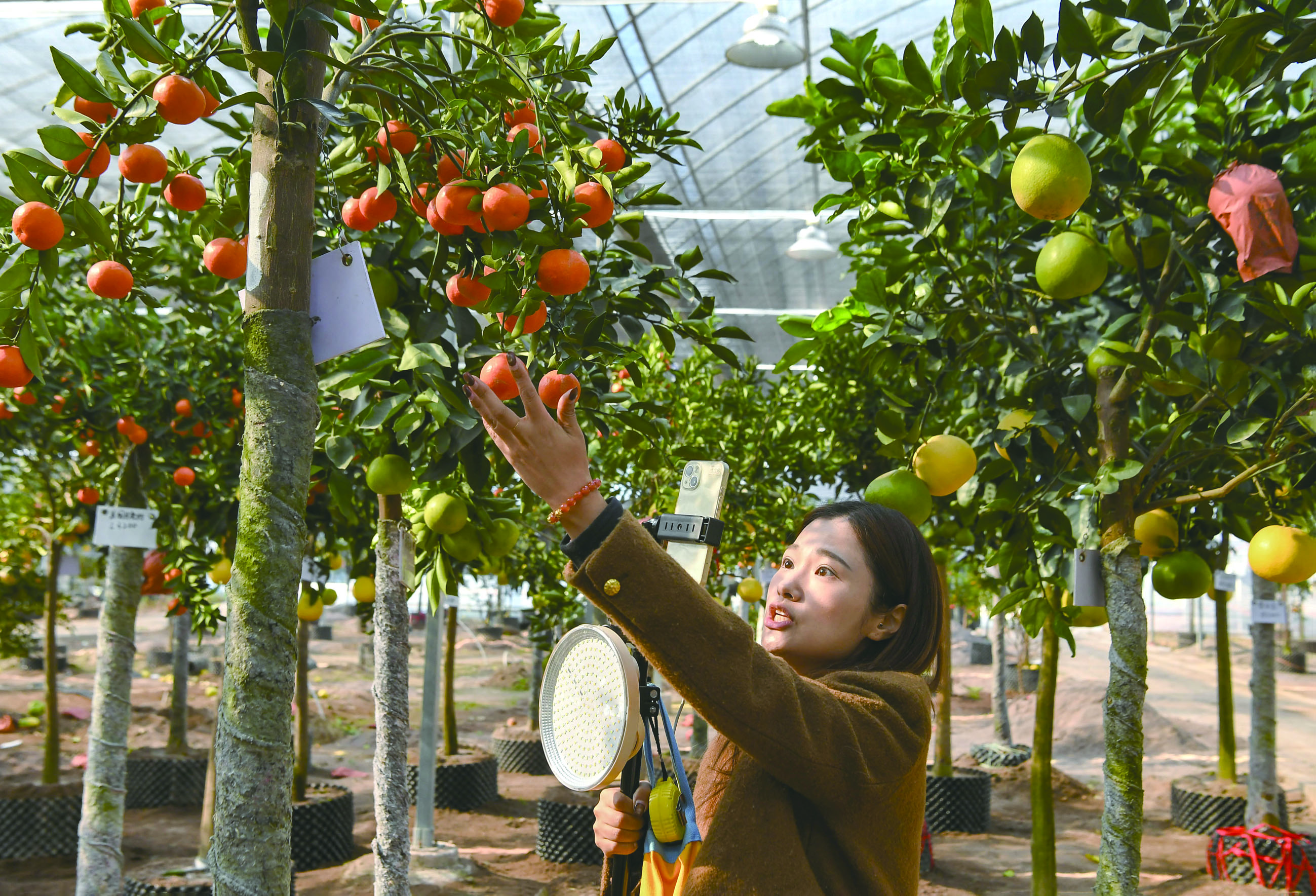记者 时宽兵 文/摄 11月21日,金东区澧浦镇前余村“云上果园”共富工坊里,葡萄柚、砂糖橘、暹罗红柚、木瓜蜜丁等果树上的成熟果实挂满枝头,多位主播穿行于树下,通过手机直播带着客户在线选购。