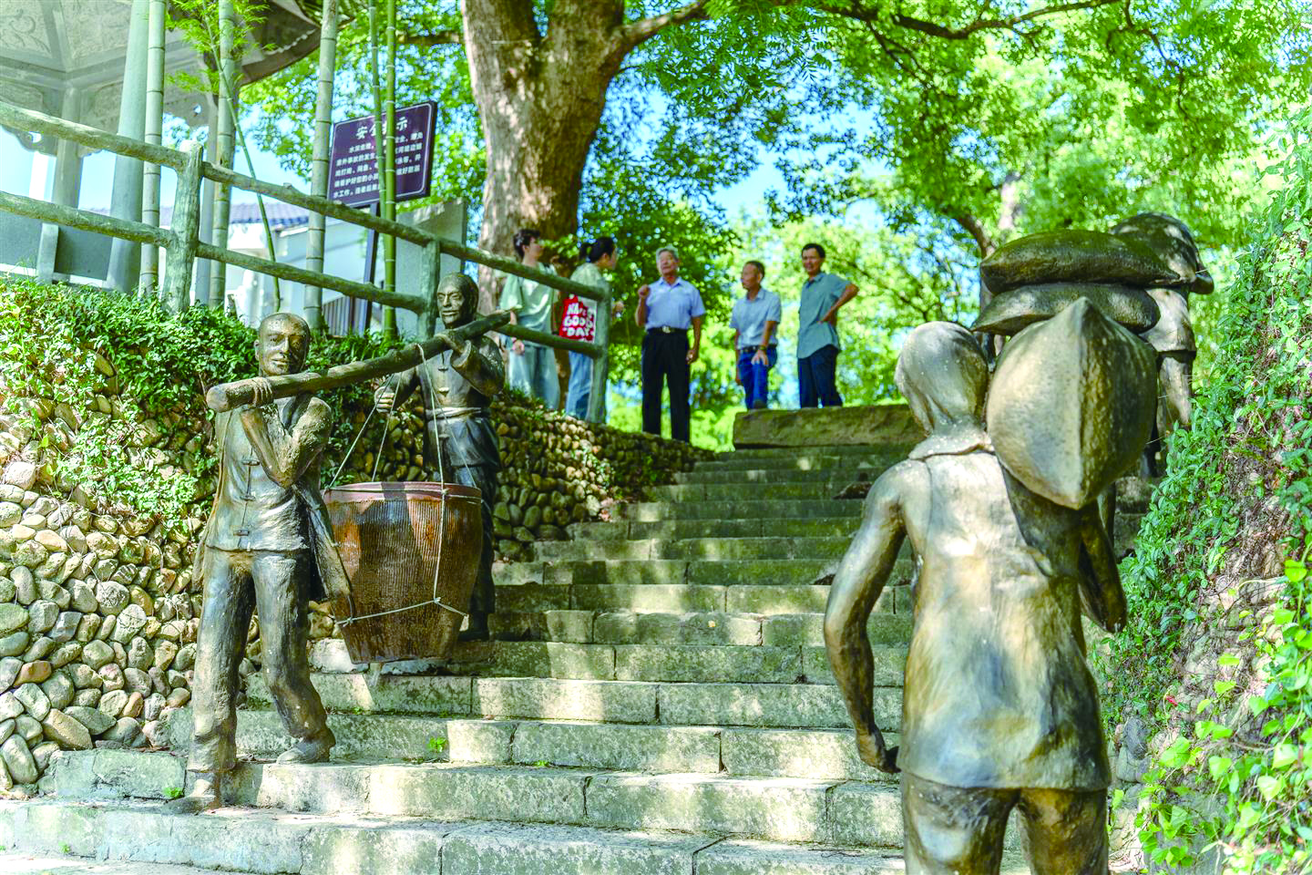 走进履坦镇履三村,穿过古老的申明街,便来到武义江边的梅溪公园。这里复原了曾经的履坦码头景观:几个背着货物的脚夫铜像静立江边,诉说着当年的繁忙景象。55岁的村民徐国平指着水下一块隐约的青石板说:“这是下埠头货运码头的旧址,我小时候还见过纤夫光着膀子从这拉船。”