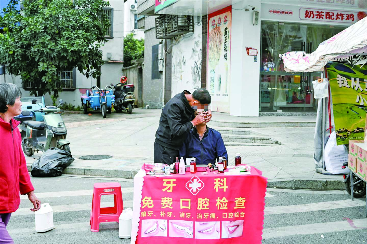 记者 李建林 文/摄 连日来,在金东区一些乡镇的农村物资交流会上,又出现乡村流动牙医和“游医”摆摊看病。执法部门提醒广大村民,警惕“游医”骗子用无痛拔牙、快速镶牙补牙等招数忽悠人,村民拔牙、镶牙,一定要到正规医院或诊所。