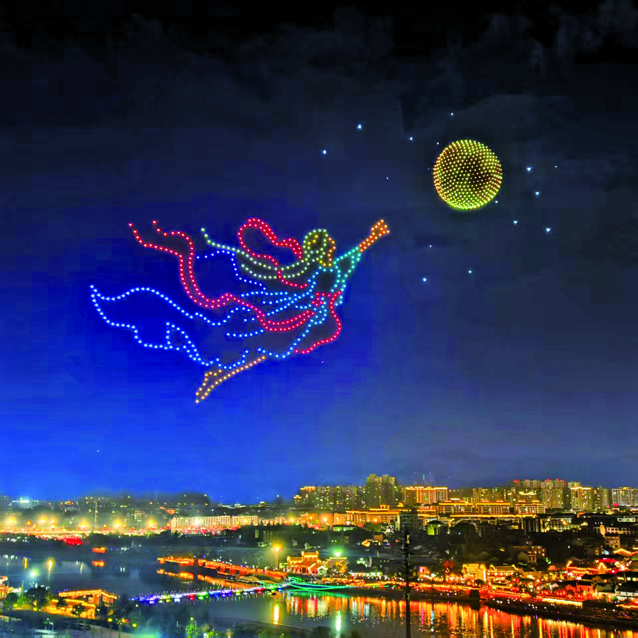 上千架无人机腾空而起,在空中变幻组合成佛堂的历史名人故事、标志性建筑等,勾勒出千年古镇的意境;江面上,高达上千摄氏度的铁水被奋力击打向天空,瞬间化作万千流星火雨……