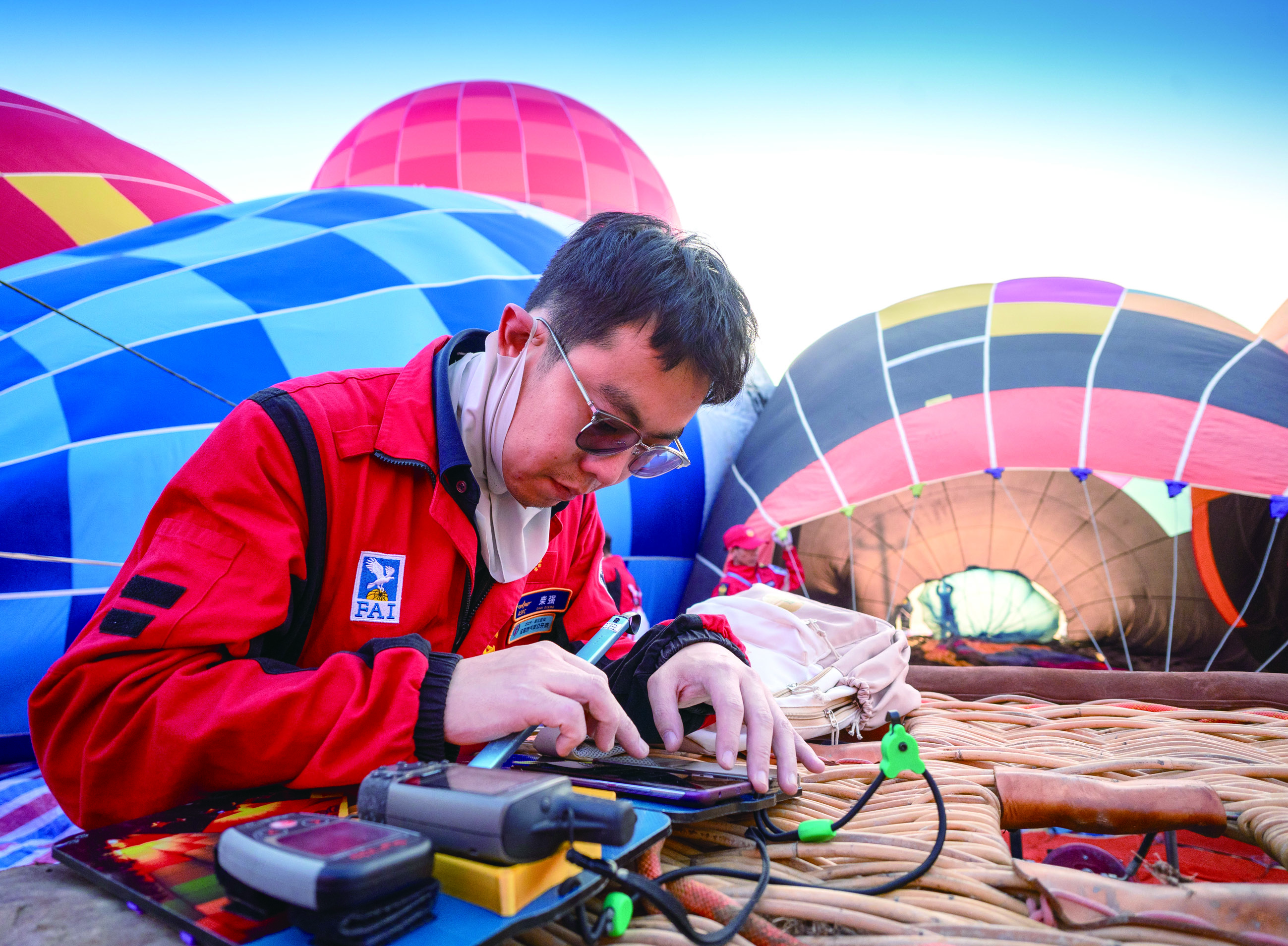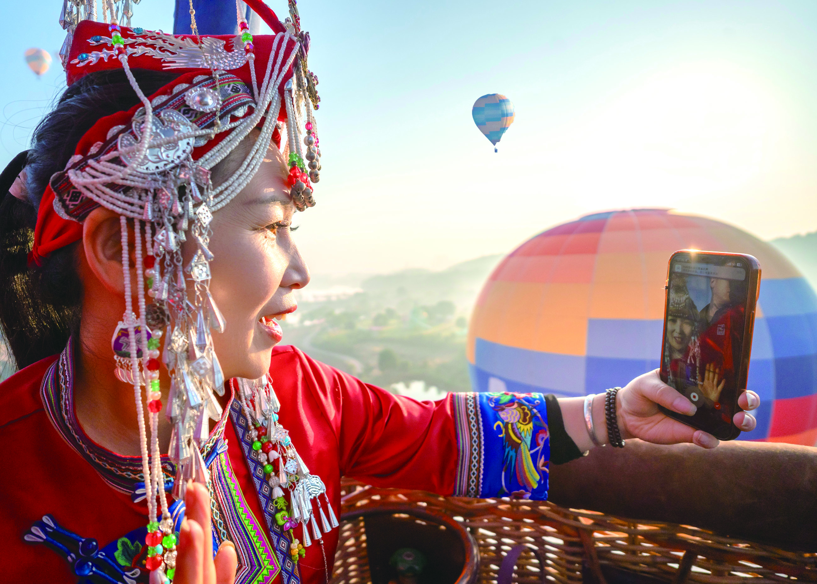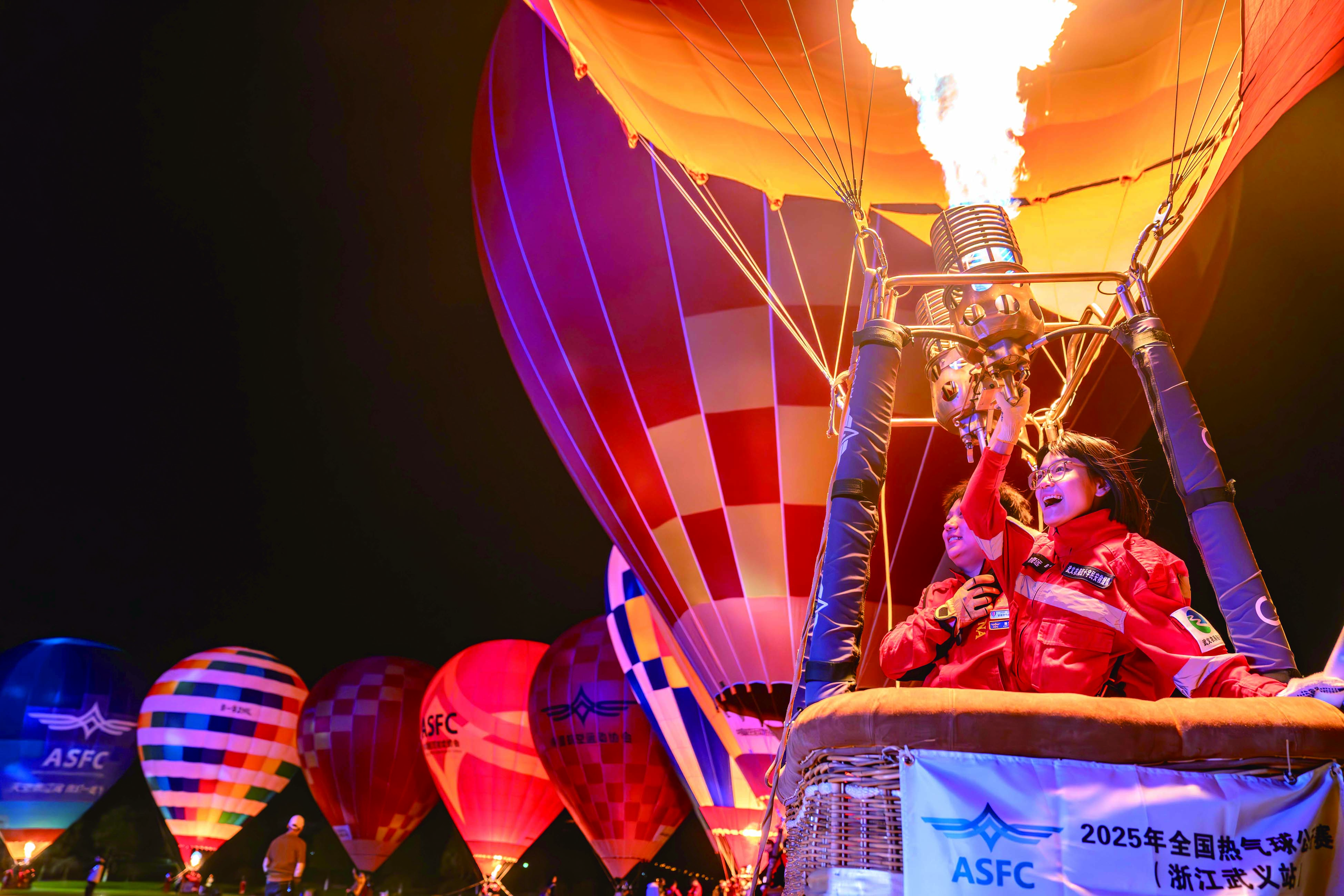 记者 陈业 钟路 通讯员 陈俊 陈芮 文/摄 晨光中,火焰喷薄的声响打破了山间的宁静。对于00后的方肖峰来说,这声音再熟悉不过。作为本次比赛的裁判组成员,也是武义大斗山飞行营地的飞行教练,他的工作与天空紧密相连。从武义县职业技术学校休闲体育服务与管理专业毕业后,他成了首批当地培养出的低空体育人才,热气球赛事的落地,让方肖峰这样的本地青年有了施展才华的舞台。“以前学飞行总觉得要出去闯,现在家门口就有全国赛事,我们既能参赛又能参与组织,机会太多了。” 来自山西的柴强已是第二次来到武义。他熟练地整理着球囊,动作不疾不徐。“这里的飞行条件很好,氛围更让人难忘。”他去年参赛后便决定今年一定再来,武义的山川与热情成了他念念不忘的风景。 在众多身影中,蓝晓燕穿着畲族传统服饰格外引人注目,这是她特意为这次飞行准备的。当热气球缓缓上升,她的视野豁然开朗。连绵的茶山像绿色的波浪,熟溪如一条碧绿的丝带穿过城镇,星点的白墙黑瓦构成她熟悉的村落。“那是我的家。”她指着下方,语气中充满发现新大陆般的欣喜。 赛事期间,一场特别的集体婚礼在热气球下举行。新人们选择用这种简约而浪漫的方式完成人生大事。没有豪华排场,只有亲友的祝福与漫天彩球作为见证。“喜事新办,心意不减。”一位新郎说。这份新颖的仪式感,正是武义这座小城因体育而悄然变化的缩影。 夜幕降临,热气球相继收回球囊,天空重归宁静。方肖峰还在做着最后的整理,蓝晓燕已将空中的见闻通过手机分享给了家人。被点亮的梦想并未随着赛事落幕而消散,它正融入这座小城的日常,在每一个仰望天空的普通人心中种下新的可能。