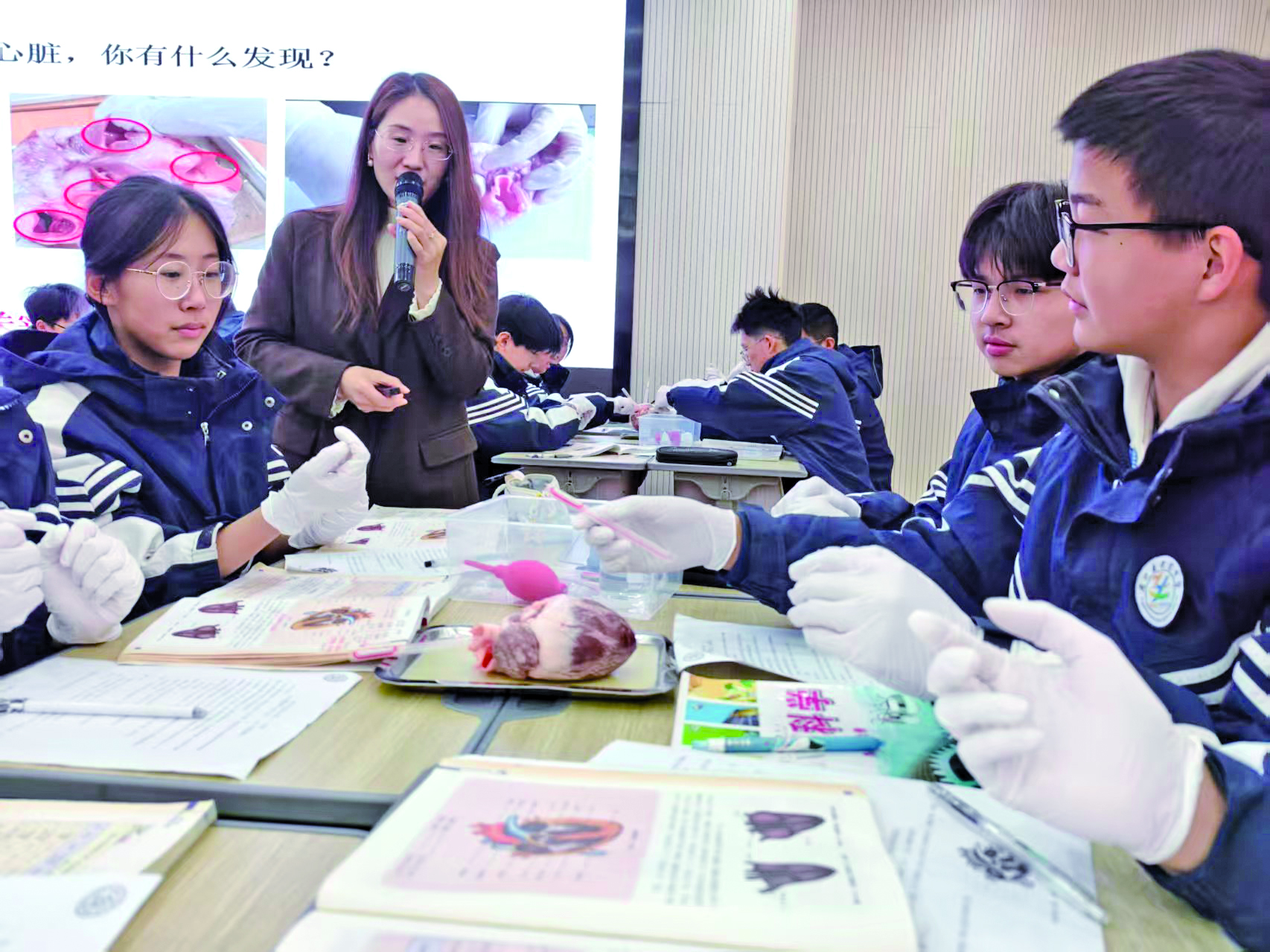 “这次观摩课老师带着我们边观察边实验,非常生动有趣,让我对心脏结构与功能有了更好的理解。”“完全没想到,这是我第一次做动物器官解剖实验。”在浦江县黄宅中学举行的一堂科学观摩课上,来自金华五中的科学老师金小丹为初三年级的学生们带来了一次别样体验——解剖猪心脏实验。在观察人体心脏模型后,学生们对猪心分别做灌水与解剖实验,明白心房、心室、动脉等的工作原理,并通过触摸、解剖猪心,认识心脏结构及其工作过程……这堂操作性极强的科学课,让学生们在实验中“知心”、在拓展中“用心”、在生活中“爱心”,受到在场观摩人员的高度认可,“它正是学生们最喜爱、最受益的样子”。