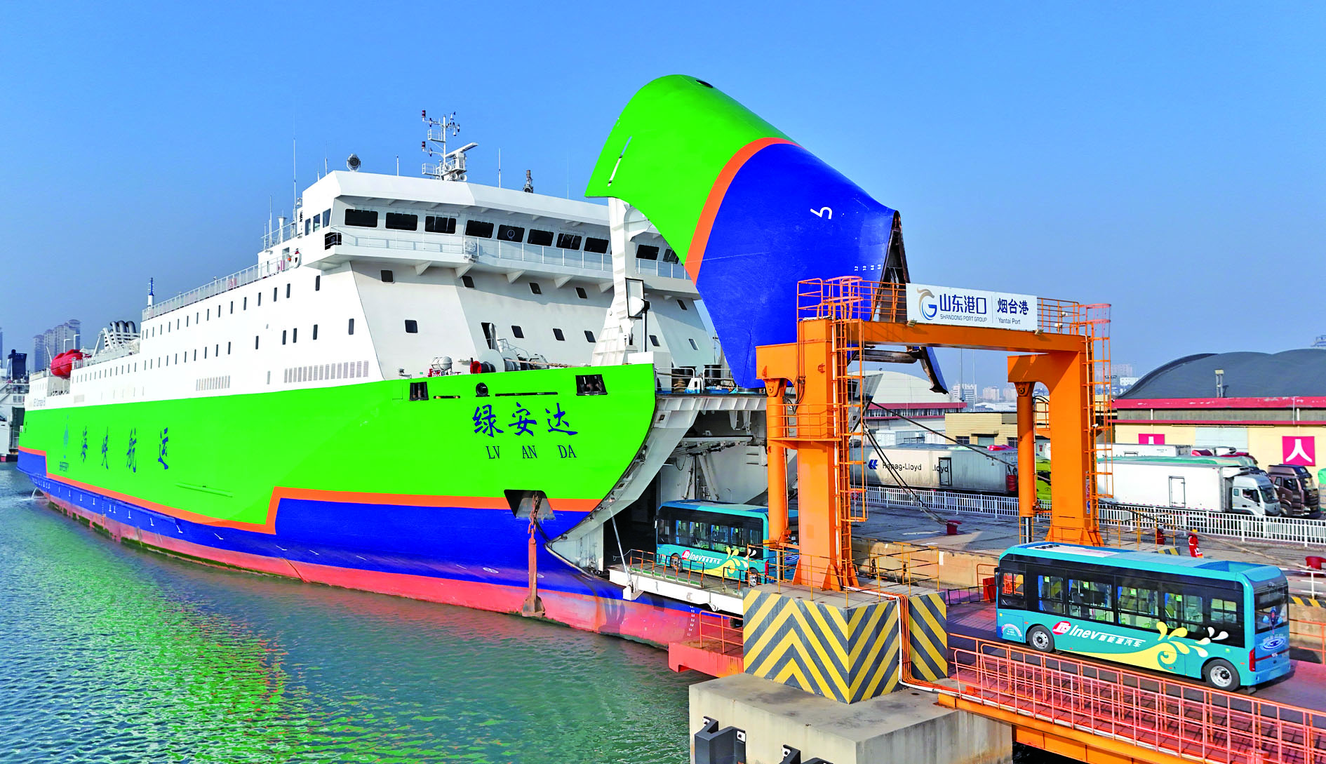 11月30日,一批全新的纯电动公交车在山东港口烟台港登上新能源汽车运输船“绿安达”轮,跨越渤海海峡前往辽宁大连,交付大连交运集团。新华社发