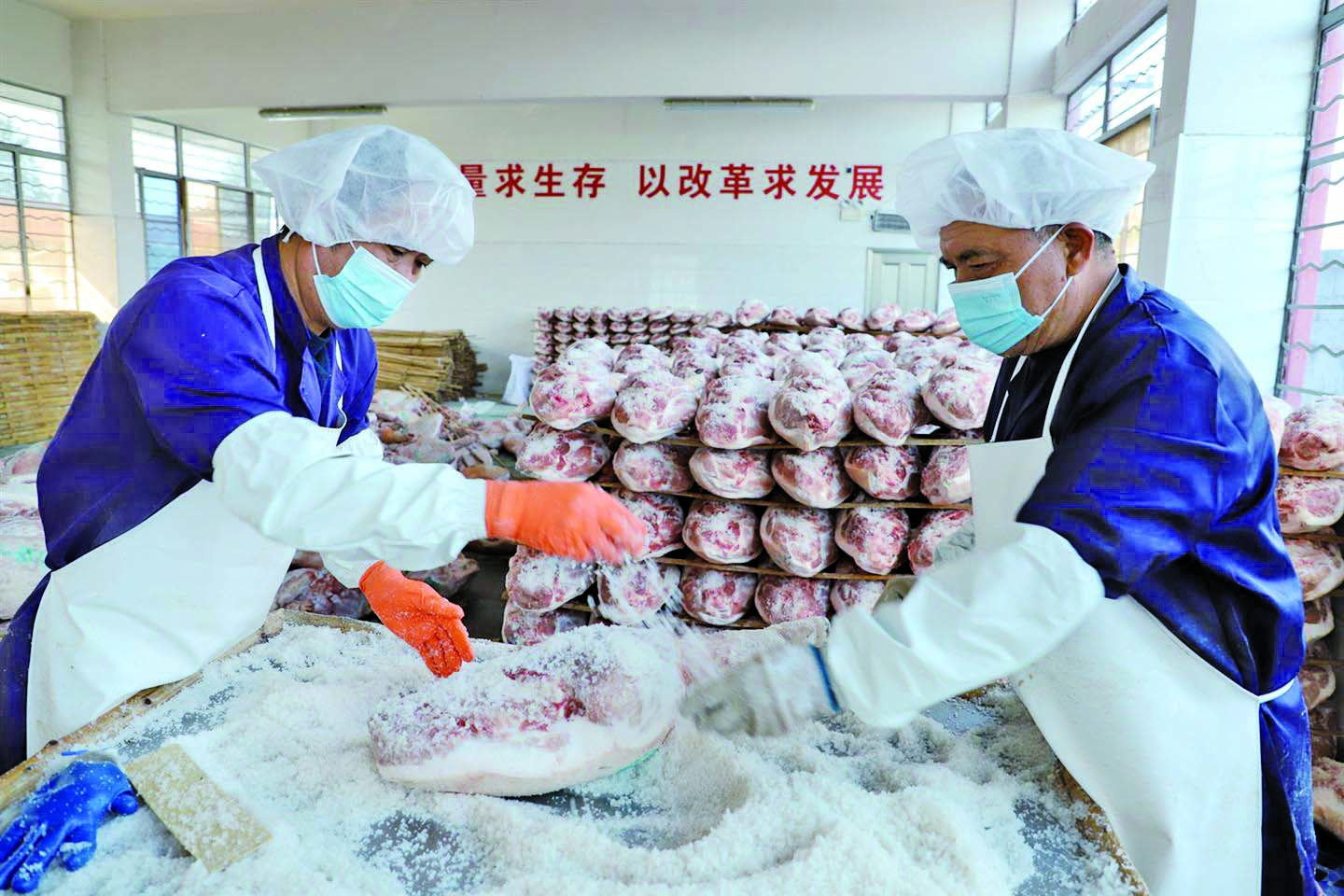 记者 罗钟炉 董超毅 文/摄 秋冬换季,首批4000多只东阳“雪舫蒋”火腿开始腌制。“雪舫蒋”是金华火腿唯一的百年老字号,精选猪后腿,经过传统腌制、洗晒、风干与发酵等百余道复杂工艺,成品色泽红润、腿形似琵琶,被誉为金华火腿中的极品。传统上,“雪舫蒋”火腿每年冬季进行腌制,立冬后气温降低,是腌制火腿的理想时节。 今年火腿开腌,恰逢火腿产业迎来新的发展机遇——金华火腿国家地理标志保护示范区日前获国家批准设立。国家地理标志保护示范区是在国家知识产权局认定的地理标志产品的基础上,对具有较大产业规模、显著社会经济效益、较高保护水平的地理标志产品实施特别保护的区域。保护示范区的设立有助于进一步加强地理标志产品保护,提升产品市场竞争力,从而促进地方经济发展。该示范区作为全国首批国家地理标志保护示范区之一,对金华火腿包括“雪舫蒋”在内的地理标志产品,提供制度性保护与规范化生产标准。 金华火腿制作省级非遗代表性传承人、浙江雪舫工贸有限公司创始人吴荣仁表示,他们将以此次金华火腿国家地理标志保护示范区获批成立为契机,进一步扩大生产规模,年生产加工金华火腿力争突破5万只。