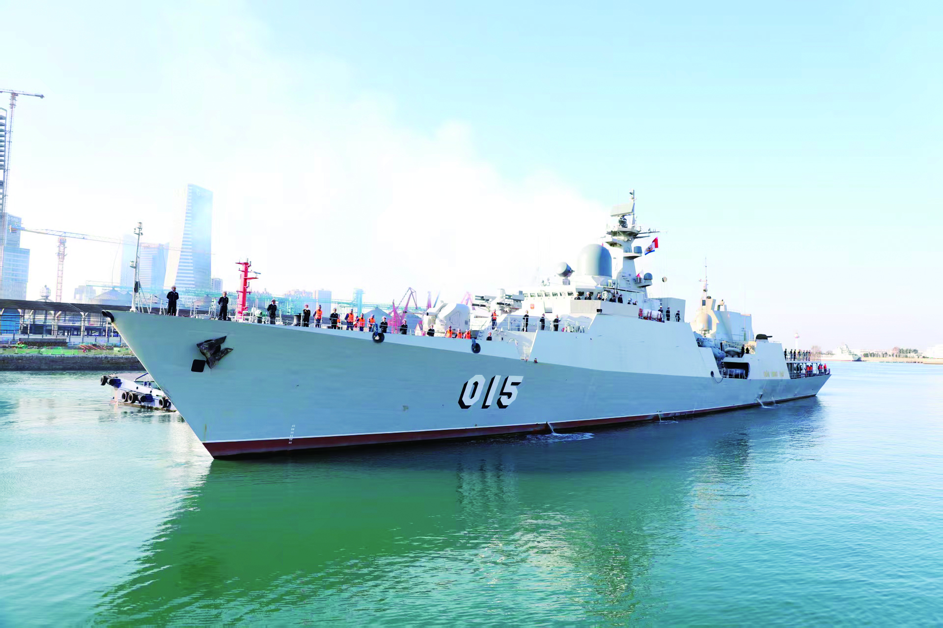 12月1日上午,越南海军“陈兴道”号护卫舰(舷号015)抵达山东青岛某军港码头,开始为期4天的访问交流活动。 新华社发